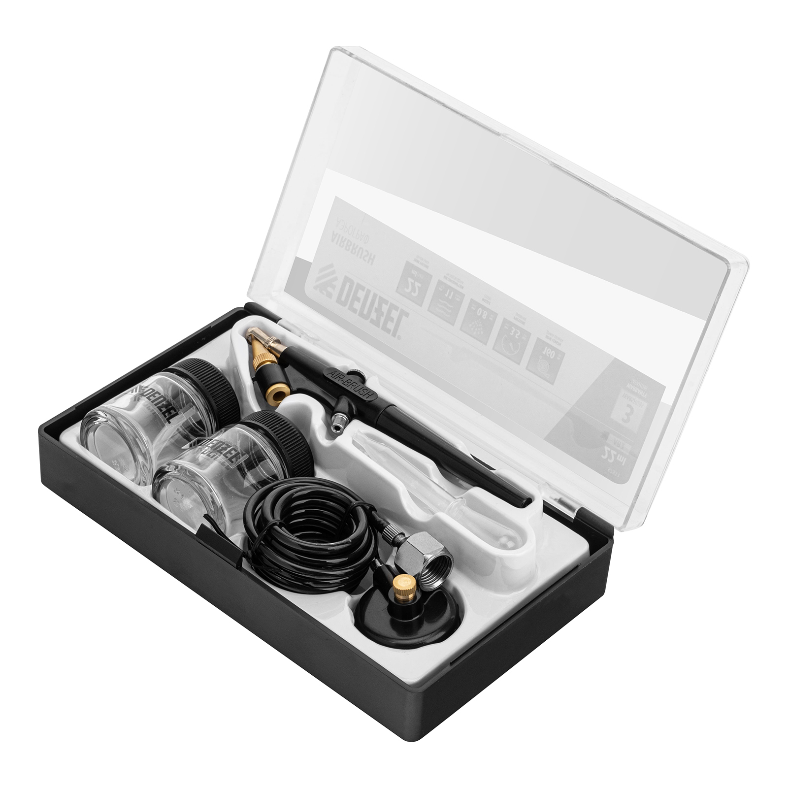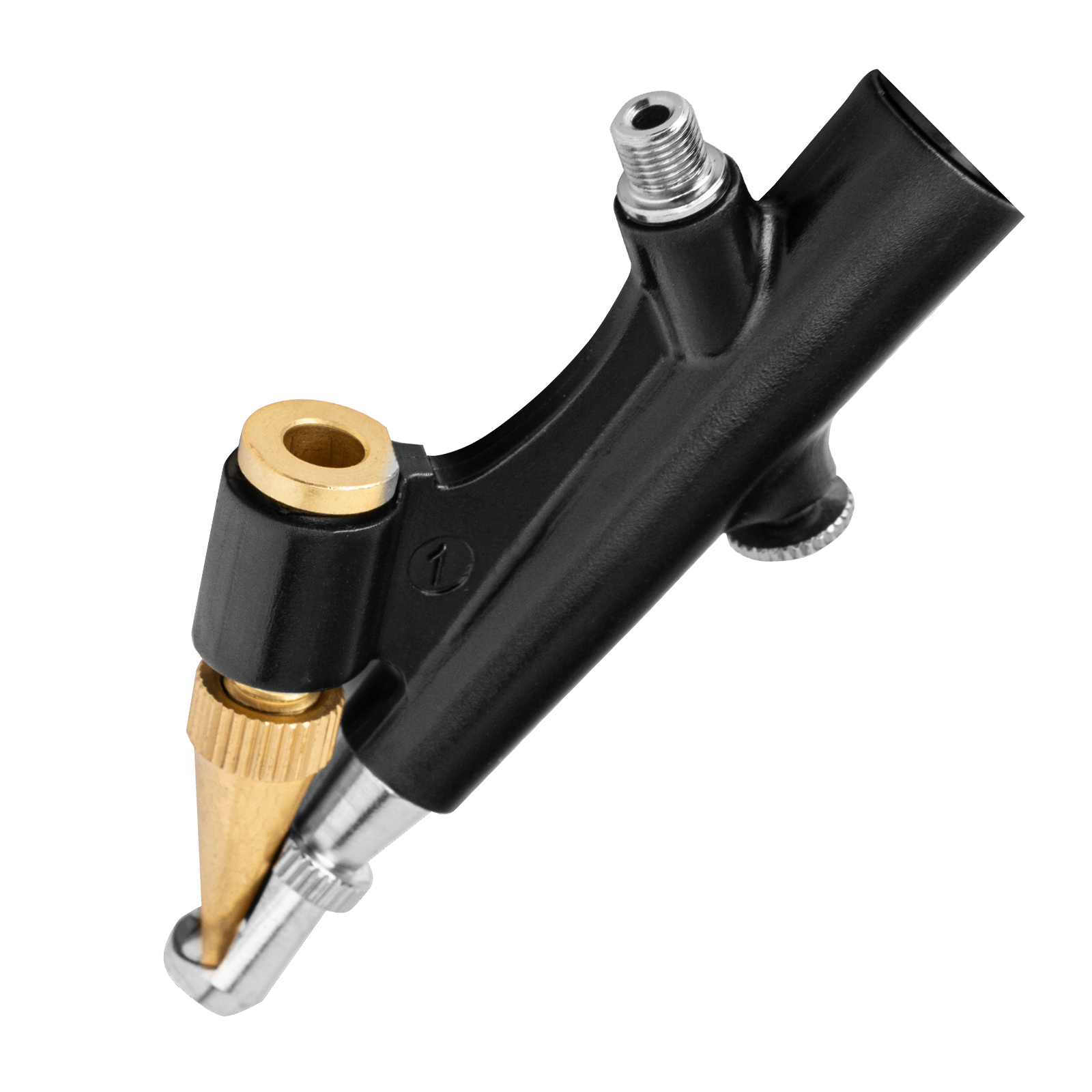 - Продуманная комплектация — аэрограф поставляется с дополнительным бачком, крышкой-переходником и дозатором для краски.