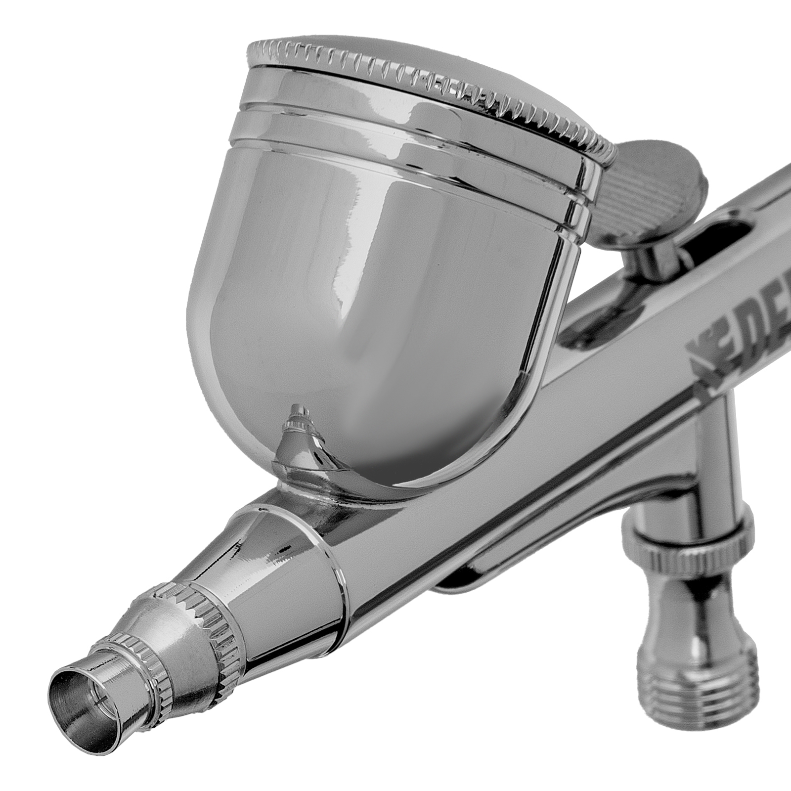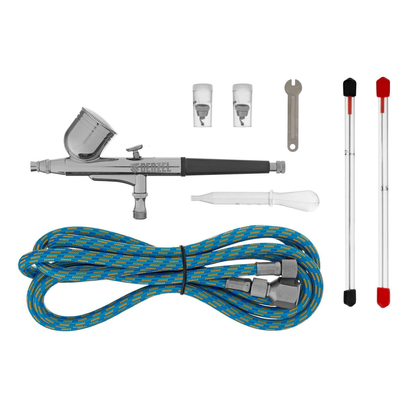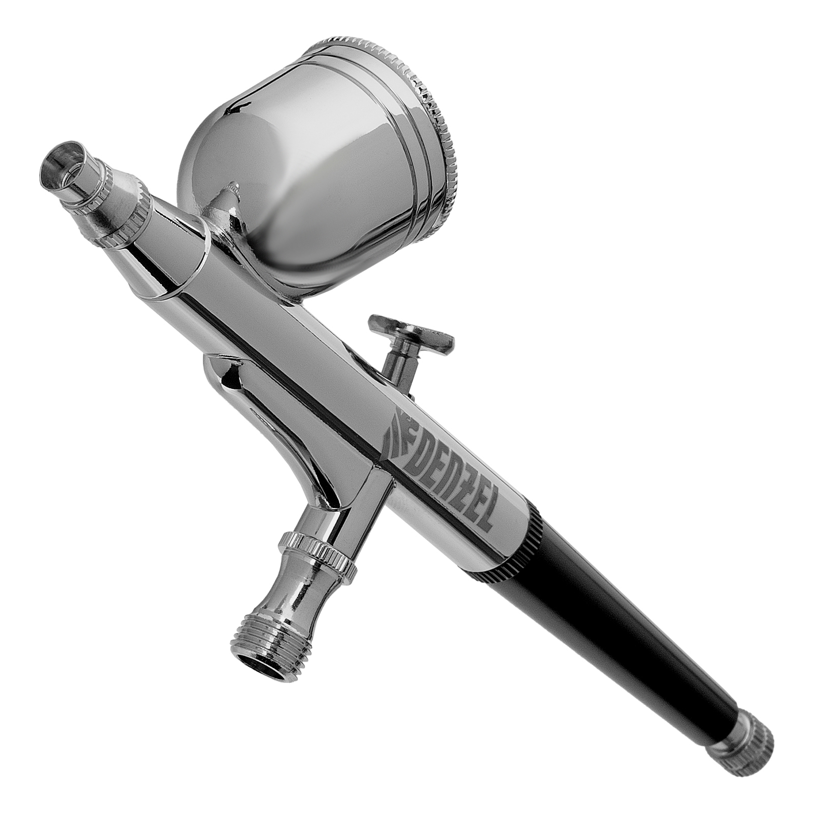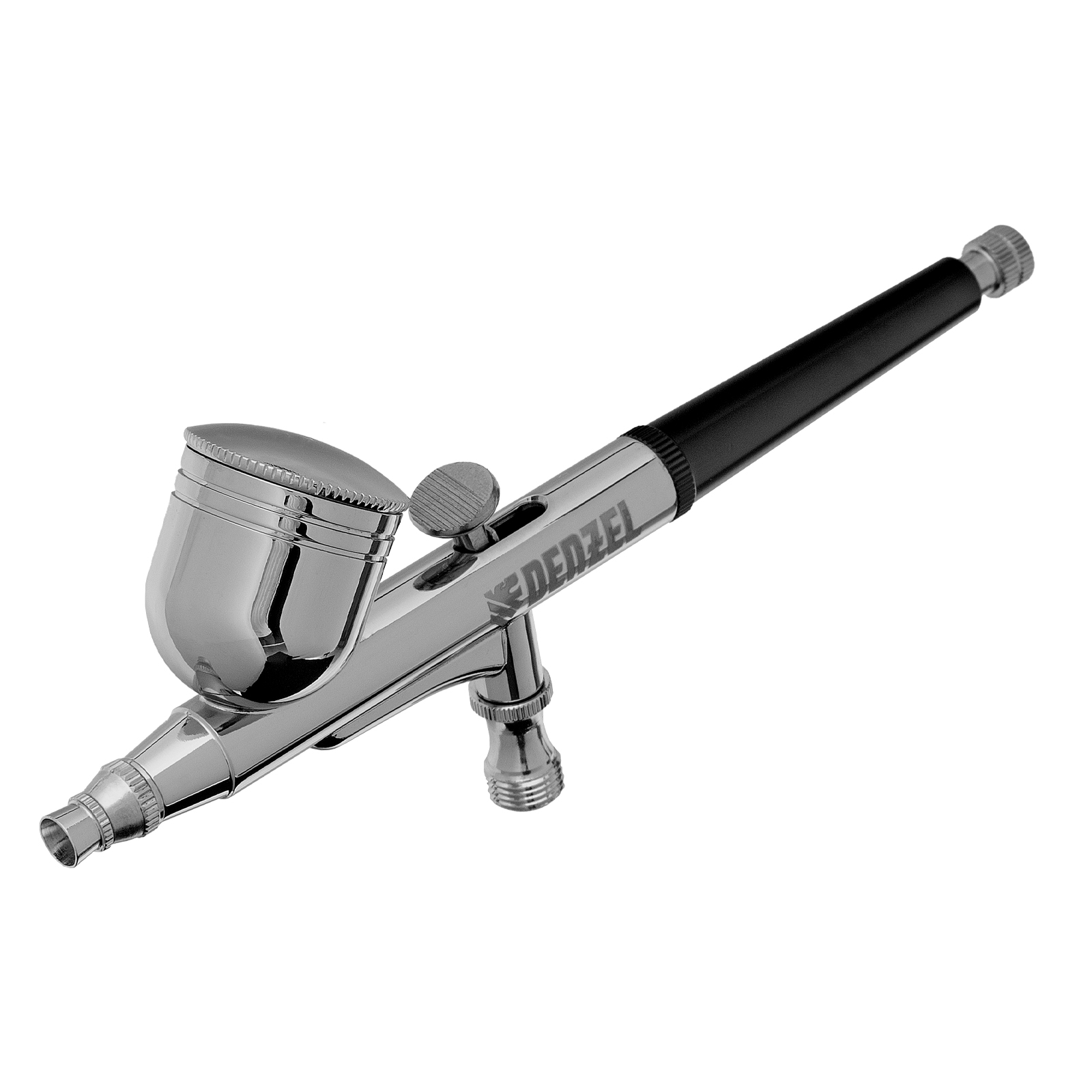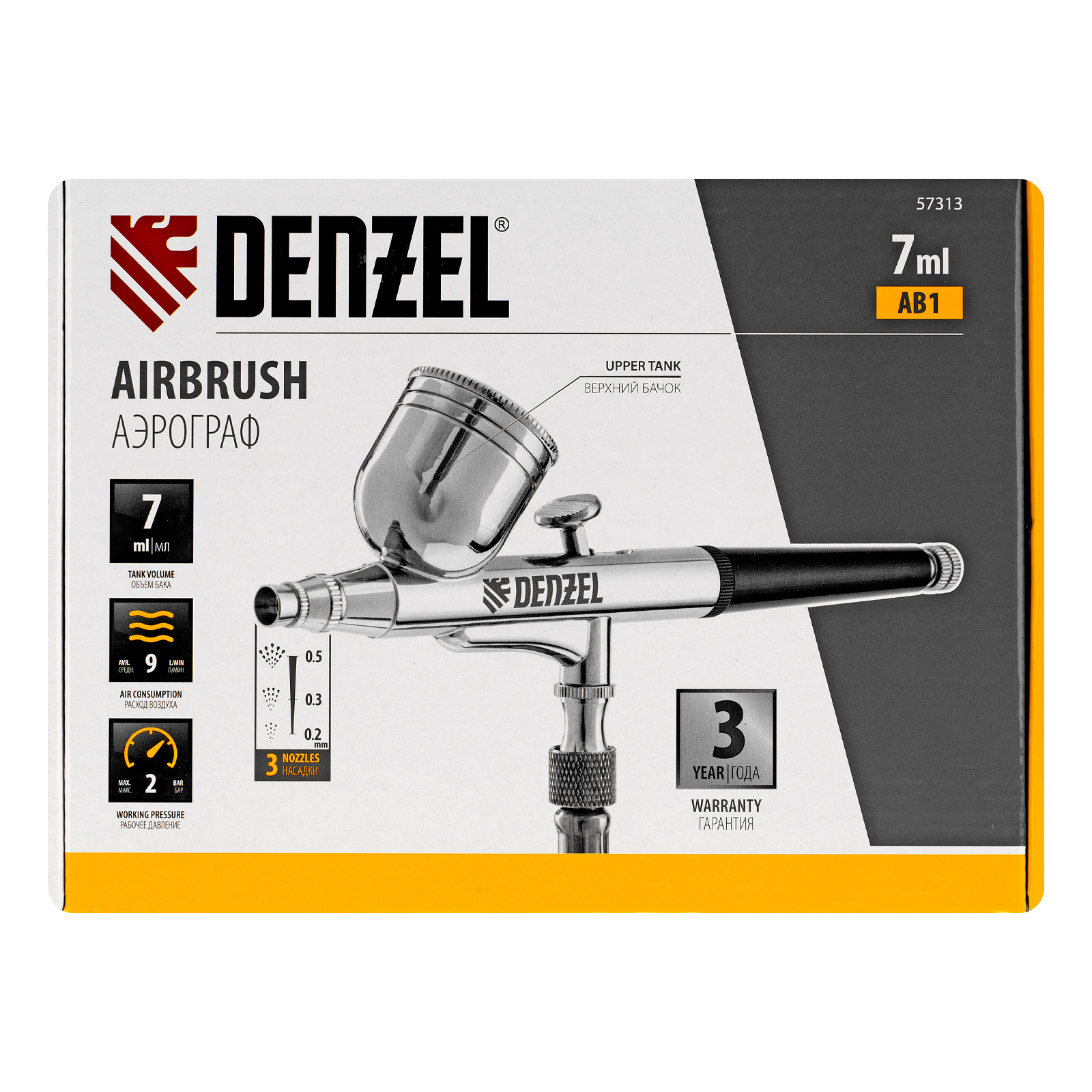 Аэрограф Denzel AB1 57313 с верхним бачком объемом 7 мл распыляет краску, расходуя 9 л сжатого воздуха в минуту и формируя струю диаметром 0,2, 0,3 или 0,5 мм. Позволяет наносить лакокрасочный материал (ЛКМ) тонким слоем, обеспечивает четкую прорисовку мелких деталей. Формирует тонкие и широкие линии, удобен для нанесения ЛКМ круговыми движениями, а также получения точек различного размера. При помощи аэрографа можно создавать рисунки на кузовных элементах автомобилей, мото- и другой техники, а также на прочих поверхностях.