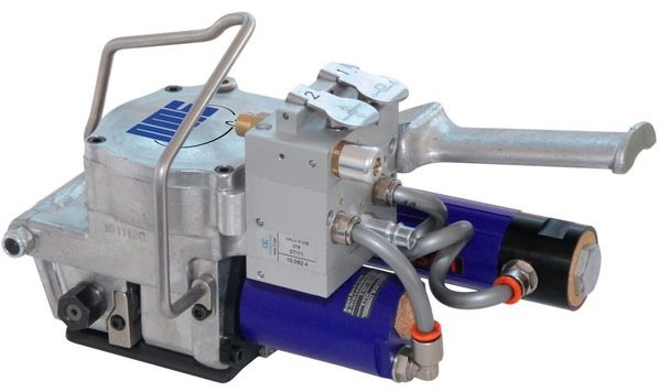 Этот инструмент для обвязки пластиковой лентой является пневматическим, что весьма выгодно отличает его от подобной электрической аккумуляторной упаковочной машинки, так как позволяет пользоваться им без подзарядки батареи. Помимо этого этот инструмент весит - 4,9 кг. Ширина используемой ленты варьируется от 10 до 19 мм, а толщина от 0,4 до 1,2 мм. Максимальная сила натяжения регулируется и может достигать до 2500 Н (до 255 кгс) при давлении воздуха 6 атм. Натяжение ленты и время сварки регулируется в зависимости от ее типоразмера. Скорость натяжения составляет 11 м/мин. Эффективность соединения, как и у всех моделей, достигает 80% от максимального усилия на разрыв в зависимости от качества расходного материала.