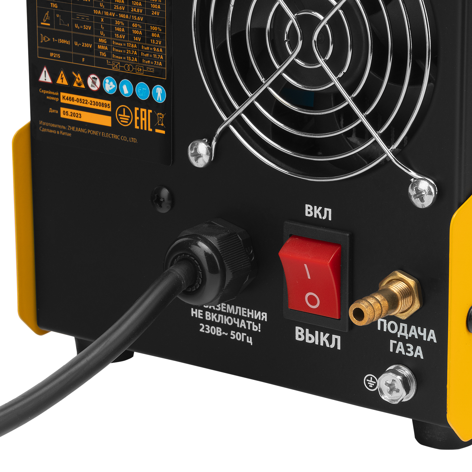 - Много рабочих режимов — MMA (ручная дуговая сварка покрытым элетродом 1,6-4 мм), MIG/MAG (полуавтоматическая сварка в среде защитного газа проволокой диаметром 0,8/0,9 мм), FCAW (сварка порошковой проволокой без подачи газа), LIFT TIG (аргонодуговая сварка вольфрамовым неплавящимся электродом, горелка в комплект не входит).
