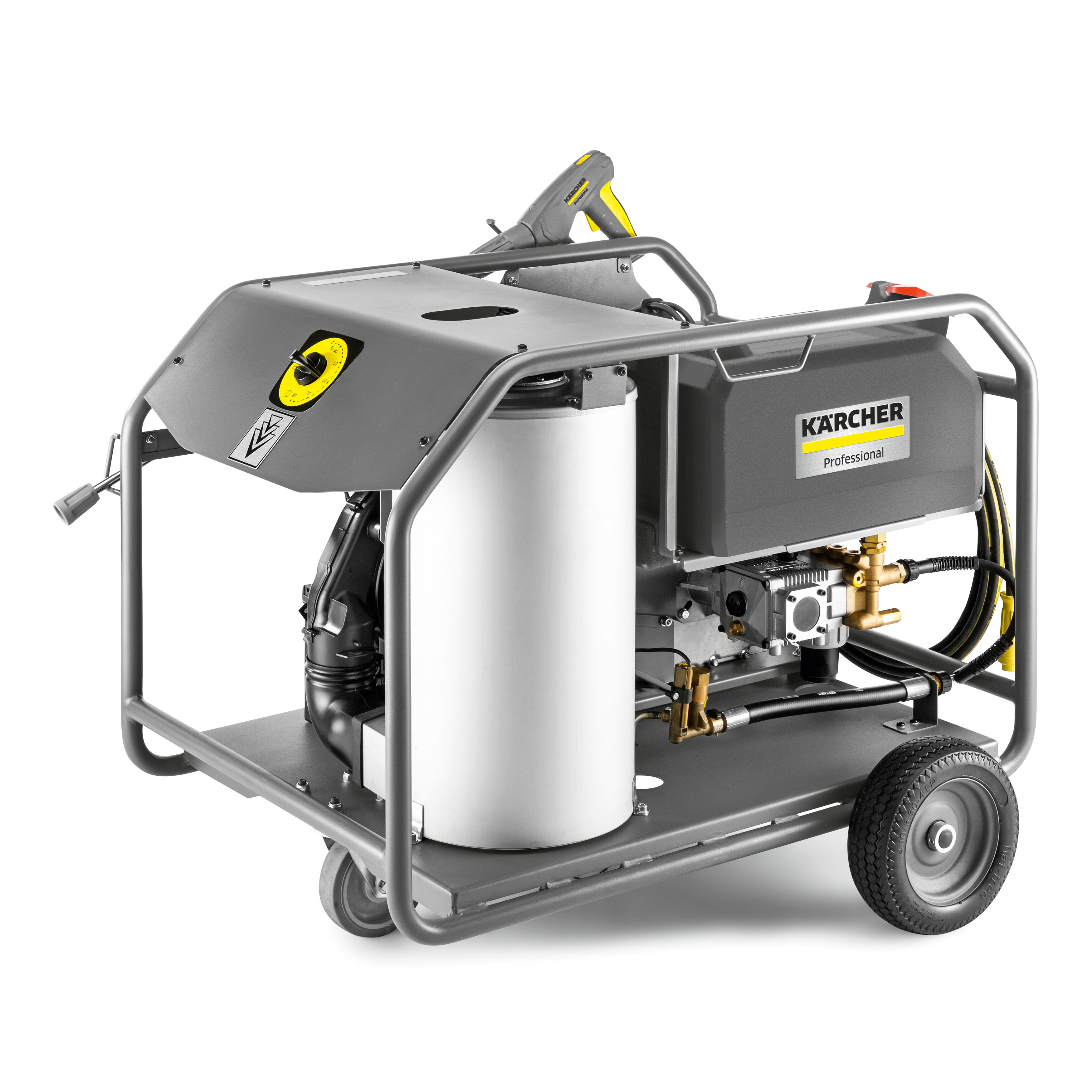 Отличная эргономика, мобильность, надежность и удобство эксплуатации обеспечиваются сплошными резиновыми колесами, направляющим роликом со стояночным тормозом, удобными ручками и единым переключателем для регулировки температуры. Такие принадлежности, как шланг высокого давления и струйная трубка, можно хранить прямо на аппарате. Стальная трубчатая рама допускает транспортировку краном.