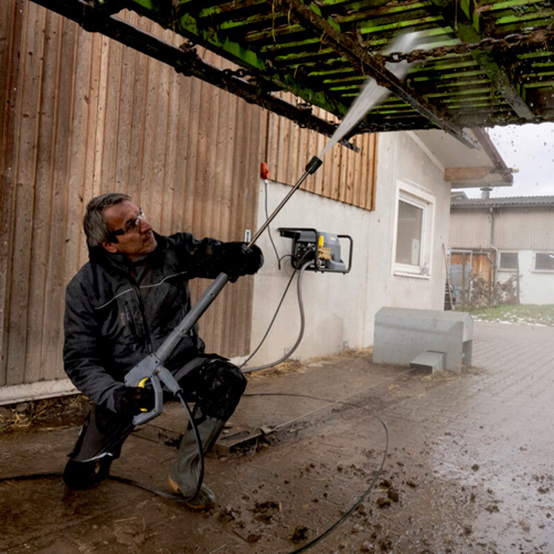 Модель оснащена мощным и легким в настройке насосом с коленчатым валом и низкооборотным 4-полюсным двигателем воздушно-водяного охлаждения с системой автоматического отключения. Насос защищен от частиц грязи встроенным фильтром для воды, допускающим легкую очистку. Стандартная комплектация включает все необходимое: пистолет, струйную трубку, шланг высокого давления длиной 10 м и мощное сопло.