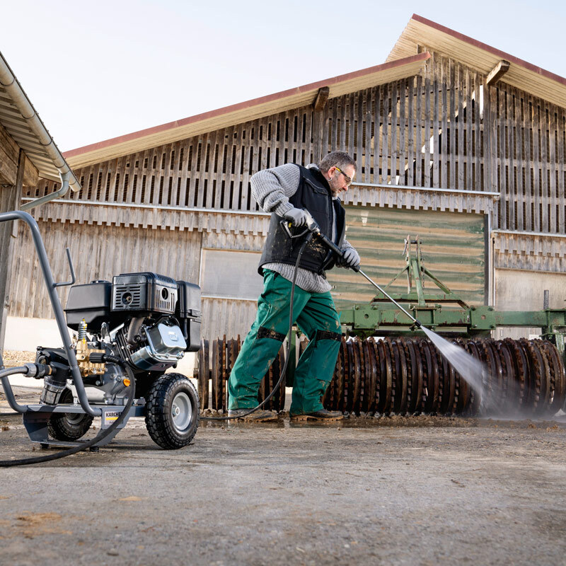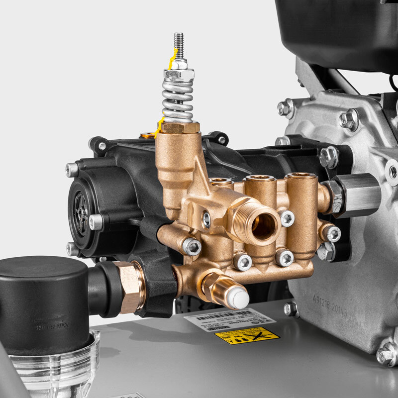 Мощный бензиновый двигатель EU STAGE V, соответствующий экологическим европейским стандартам по ограничению вредных выбросов, позволяет выполнять уборку даже в местах без внешнего источника питания; рабочее давление 150 бар, прочный насос с кривошипно-шатунным механизмом и поток до 600 литров воды в час обеспечивает превосходный результат очистки.