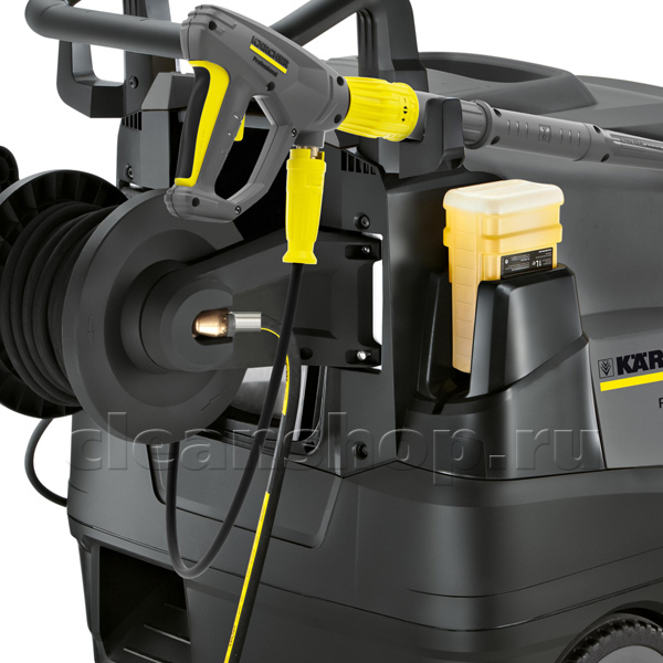 Дополнительный комфорт обеспечивает удобное хранение аксессуаров: запирающийся отсек для сопел, инструментов, расположен под крышкой корпуса, предусмотрены большие крюки для хранения кабеля и шланга, а также держатель для струйной трубки. Регулировка рабочего давления и потока воды осуществляется с помощью рукоятки Servo Control на пистолете.
