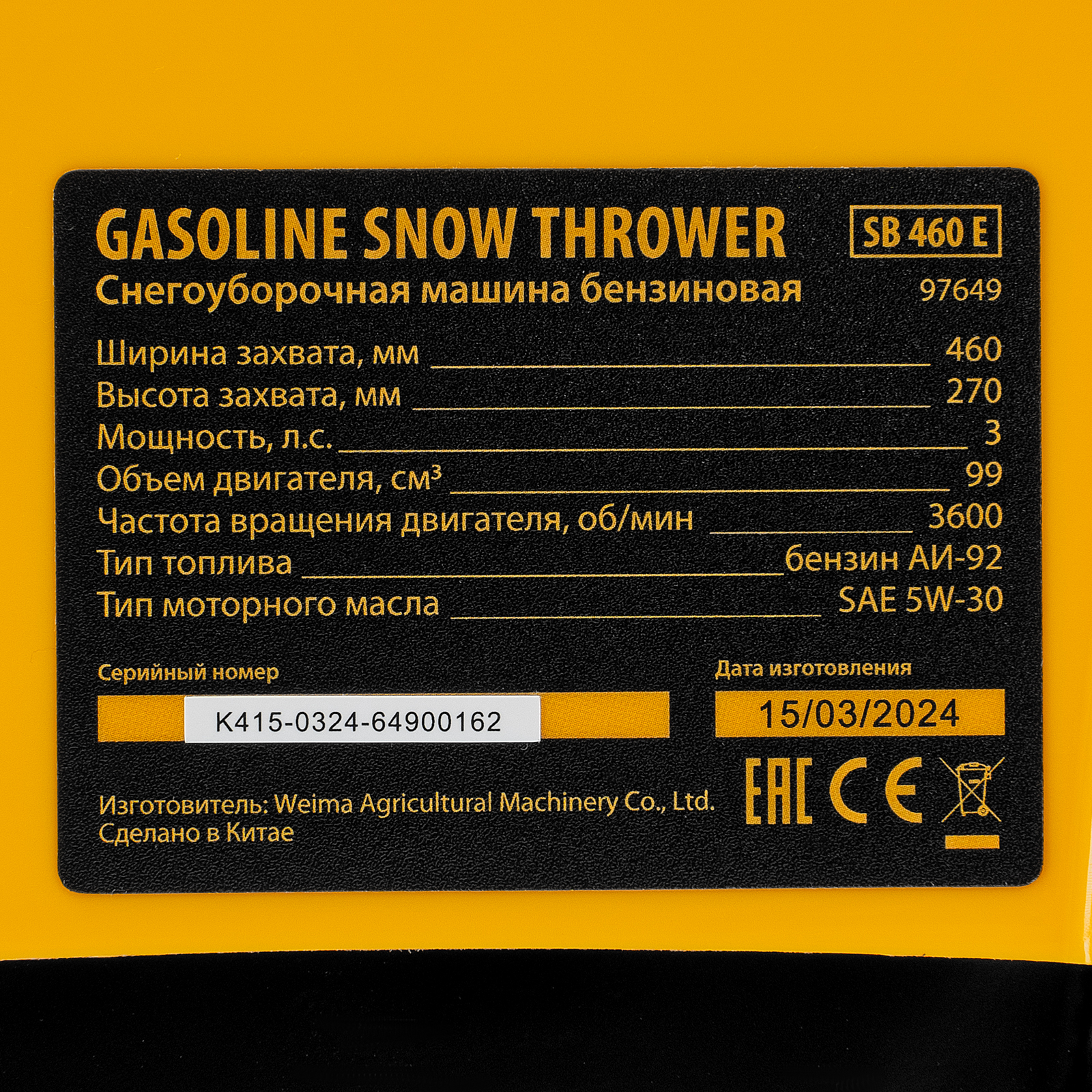 Бензиновая снегоуборочная машина Denzel SB 460 E 97649 с двигателем объемом 99 см3, электрическим стартом и эксклюзивным шнеком Snow Crusher, предназначена для очищения от снега открытых ровных поверхностей: придомовой территории, дорожек, тротуаров, автомобильных парковок. Высота захвата составляет 27 см, ширина — 46 см, дальность выброса снега достигает 10 м. Машина значительно превосходит в производительности электрические модели, оставаясь компактной и мобильной.