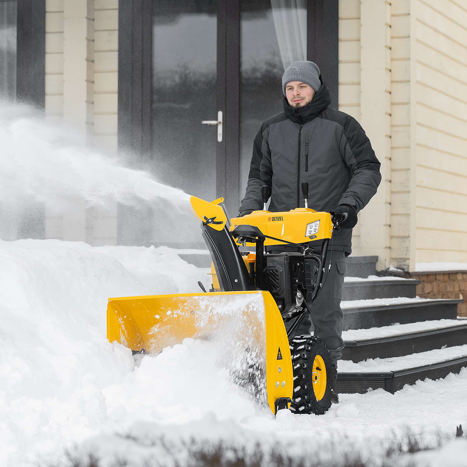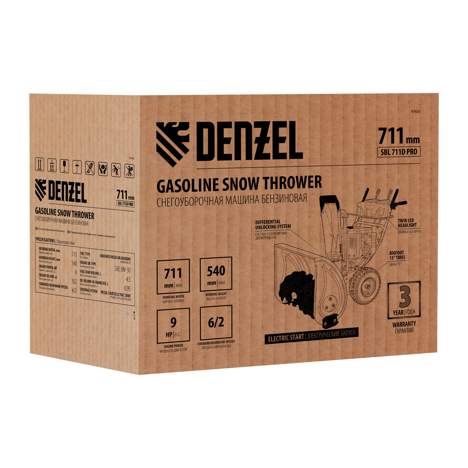 Бензиновая снегоуборочная машина Denzel SBL 711D PRO 97655 с двигателем объемом 302 cм3, электростартером, фарой, обогревом рукояток и функцией разблокировки дифференциала предназначена для уборки территорий загородных домов, коттеджей, подъездных дорог и улиц СНТ, парковок и городских дворовых территорий. Ресурсный зимний двигатель с увеличенным крутящим моментом и шнек с агрессивным профилем ледорубов обеспечивают эффективную уборку даже плотного слежавшегося снега с наледью. Ковш шириной захвата 811 мм (с учетом подрезателей Denzel 97102) и высотой захвата 540 мм эффективно справляется с высокими сугробами.