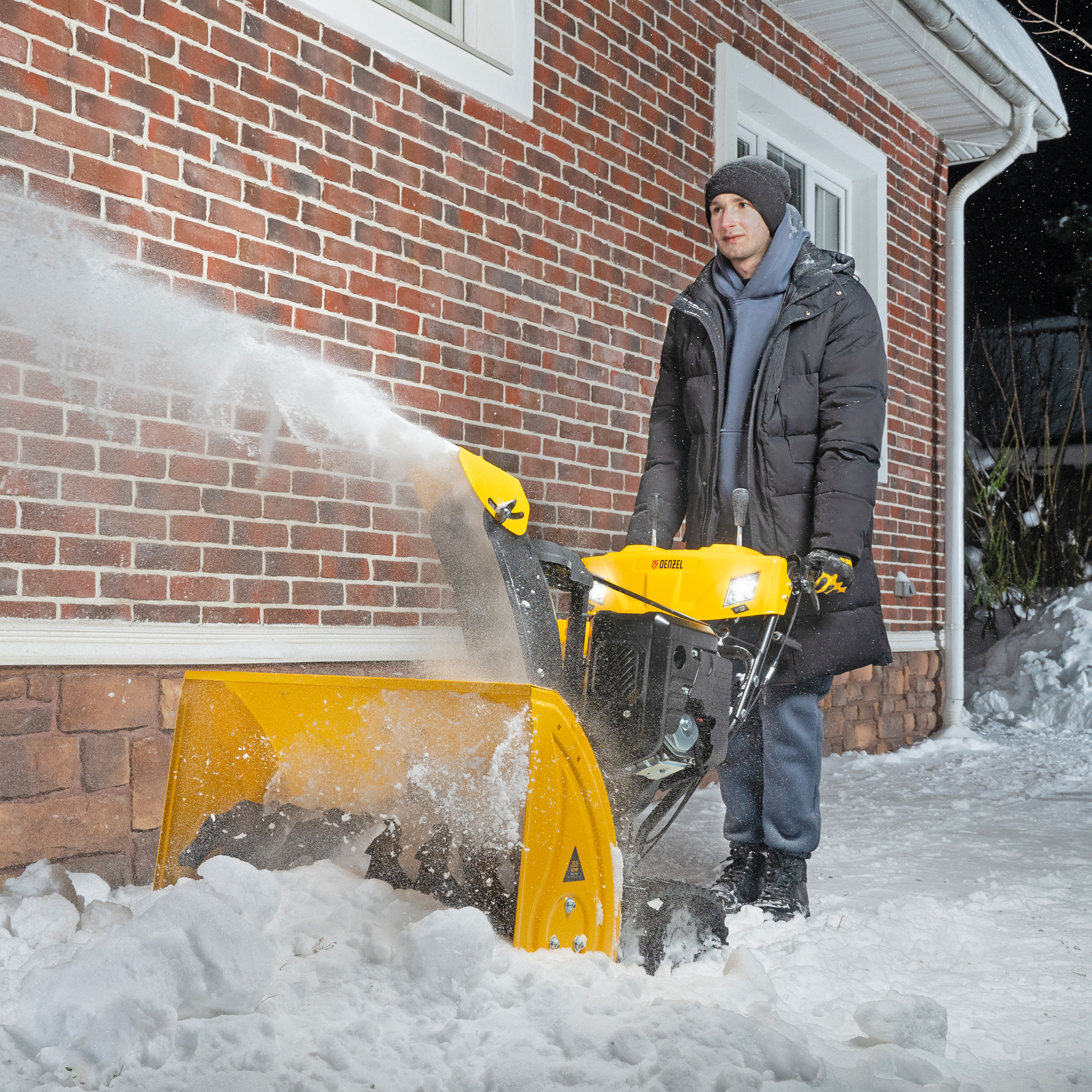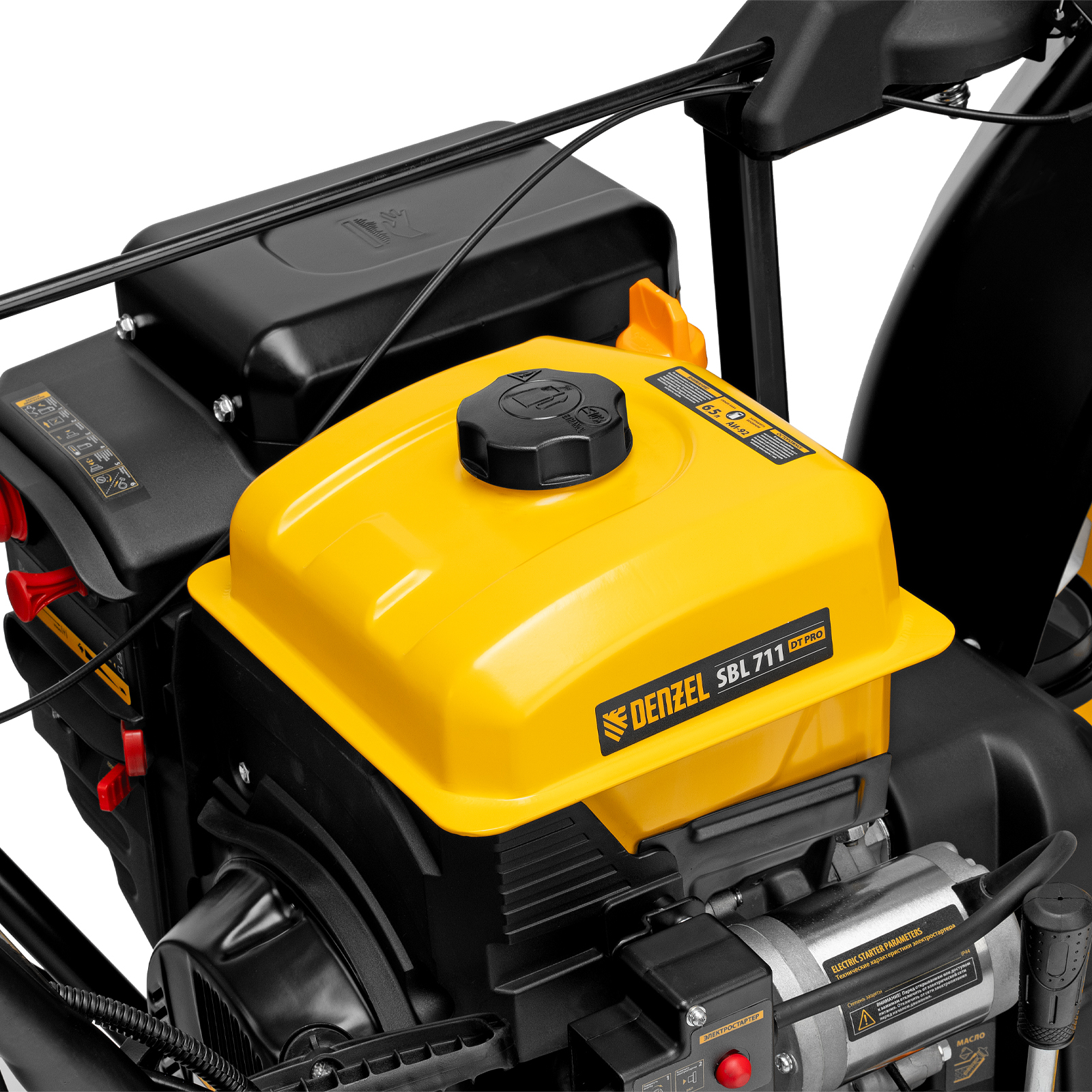 Электростартер — для быстрого запуска двигателя достаточно подключить машину к розетке 230 В и нажать на кнопку.|Ручной запуск — двигатель заведется даже при отсутствии доступа к электросети.|Быстрый старт — праймер подкачки топлива облегчает запуск холодного двигателя.|Комфортная работа в темное время суток — снегоуборочная машина оснащена яркой двойной LED-фарой.|Простой уход — в комплект входит лопатка для очистки разгрузочного желоба от снега и льда.|Увеличенные возможности — дополнительно на снегоуборщик можно установить расширители захвата, подрезатели сугроба Denzel 2 в 1 (арт. 97102).|Срезные болты в комплекте — с каждым двухступенчатым снегоуборщиком Denzel клиент получает 10 запасных срезных болтов на шнек, чтобы обеспечить бесперебойную работу техники.|Гарантия 3 года — высокое качество снегоуборочной машины подтверждено производителем.