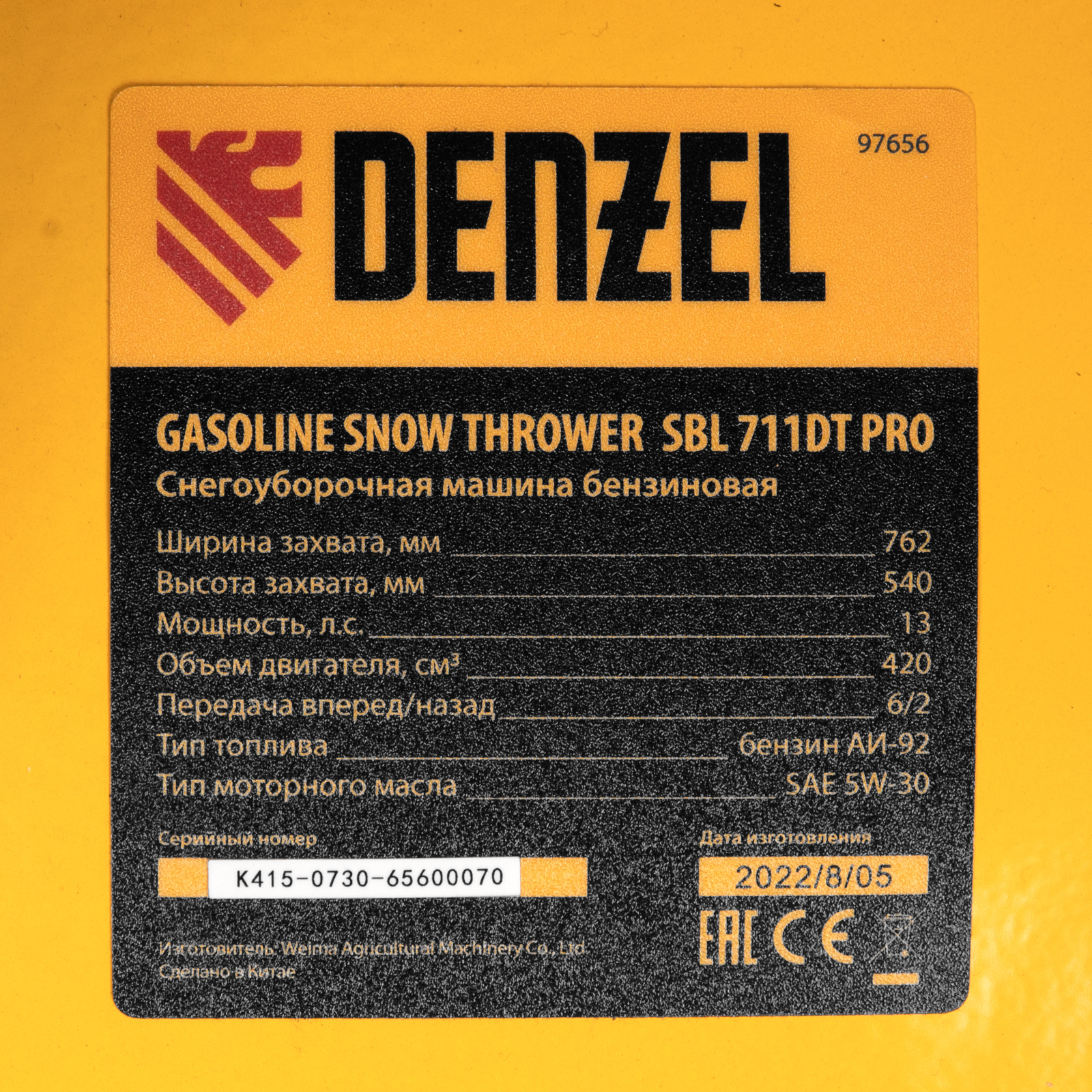 - Эффективная работа — благодаря кожуху шнека шириной захвата 862 мм (с учётом подрезателей Denzel 97102) и высоте захвата 540 мм машина быстро очищает участки большой площади.