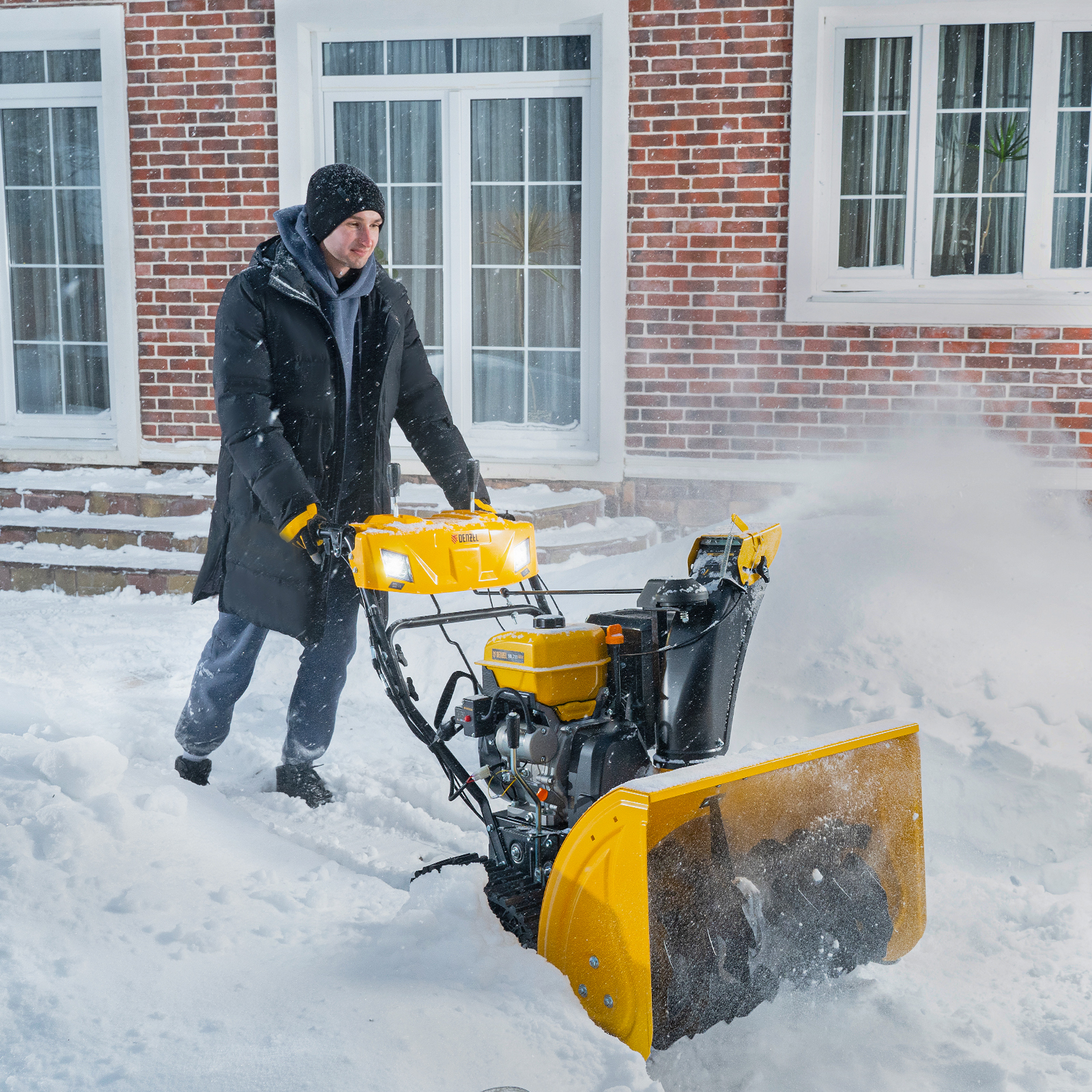 Бензиновая снегоуборочная машина Denzel SBL 711DT PRO 97656 на гусеничном приводе, с двигателем объемом 420 см3, электрическим стартером и разблокировкой дифференциала, предназначена для уборки снега на загородном участке, придомовой территории, подъездных дорогах и улицах СНТ, автомобильных парковках. Мощный двигатель обеспечивает наибольший крутящий момент 28,5 Нм и позволяет работать с любым типом снега в самых сложных погодных условиях.