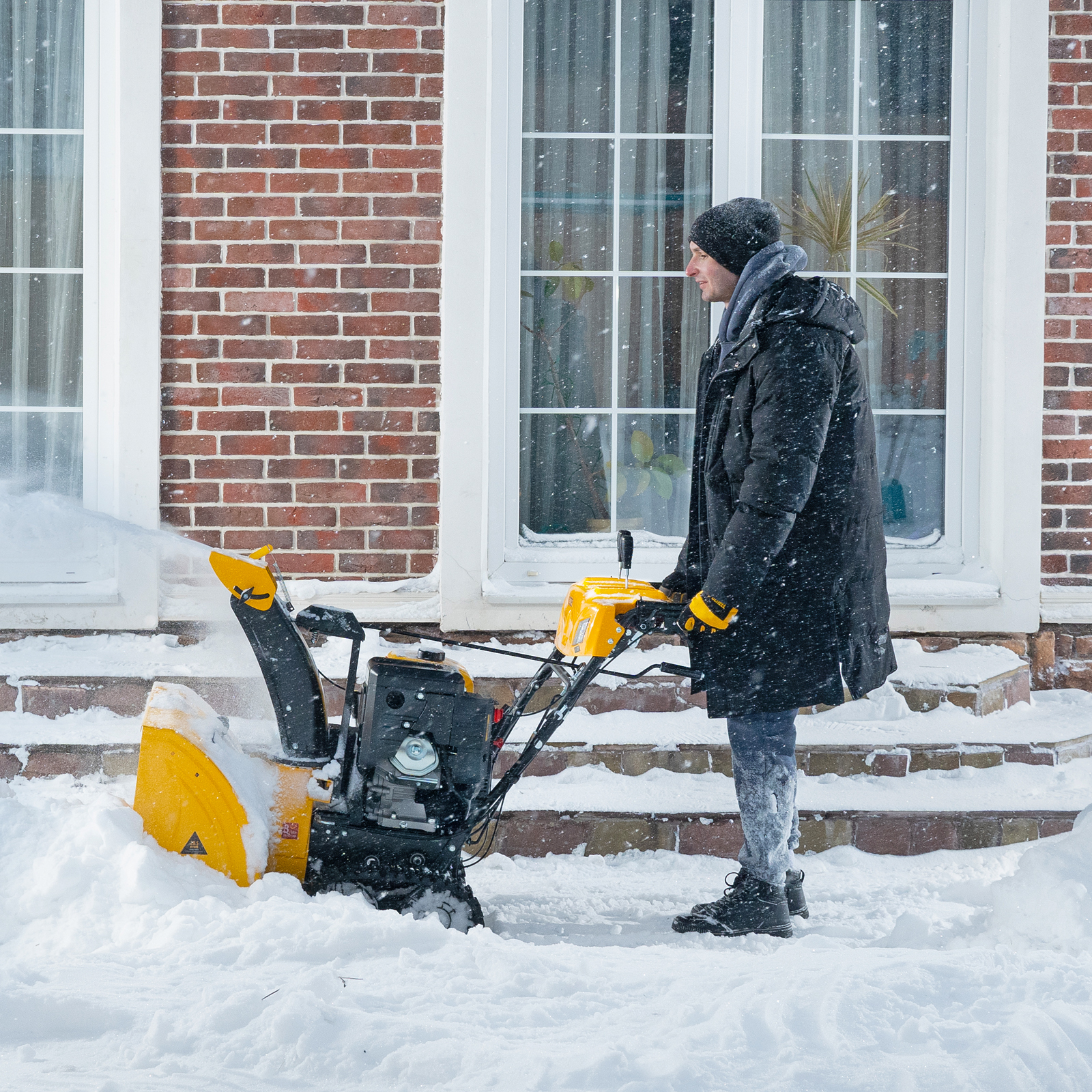 - Управление одной рукой — специальная система позволяет зафиксировать рычаг запуска шнека, пока нажат рычаг привода колес.