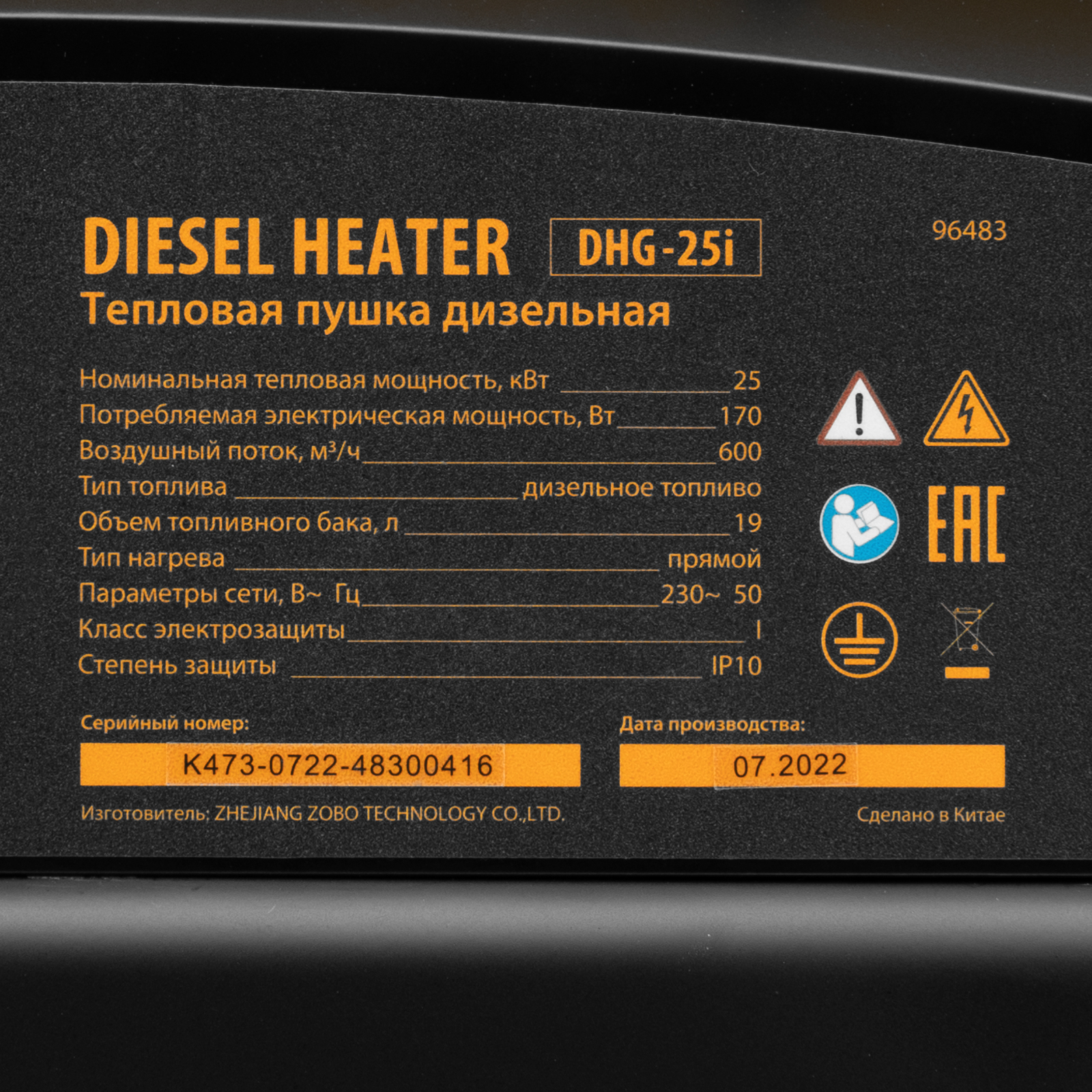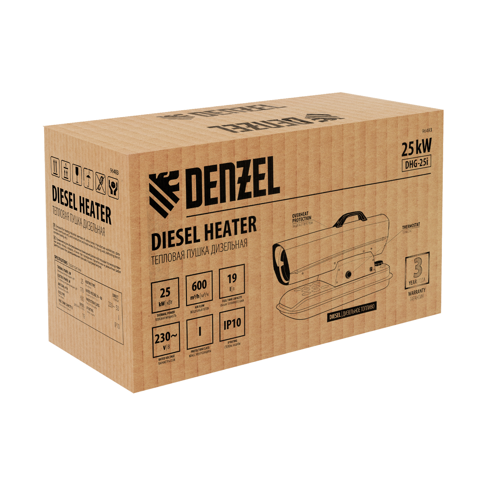 Дизельная тепловая пушка Denzel DHG-25i 96483 номинальной тепловой мощностью 25 кВт и производительностью 600 куб. м/ч, с прямым типом нагрева, с электронным термостатом, предназначена для обогрева цехов, складов, теплиц и других нежилых помещений. Используется в строительстве и на производстве. Пушка характеризуется низким расходом топлива: полного бака хватает на 10 часов работы. Важно: в обогреваемом помещении необходимо обеспечить хорошую вентиляцию.