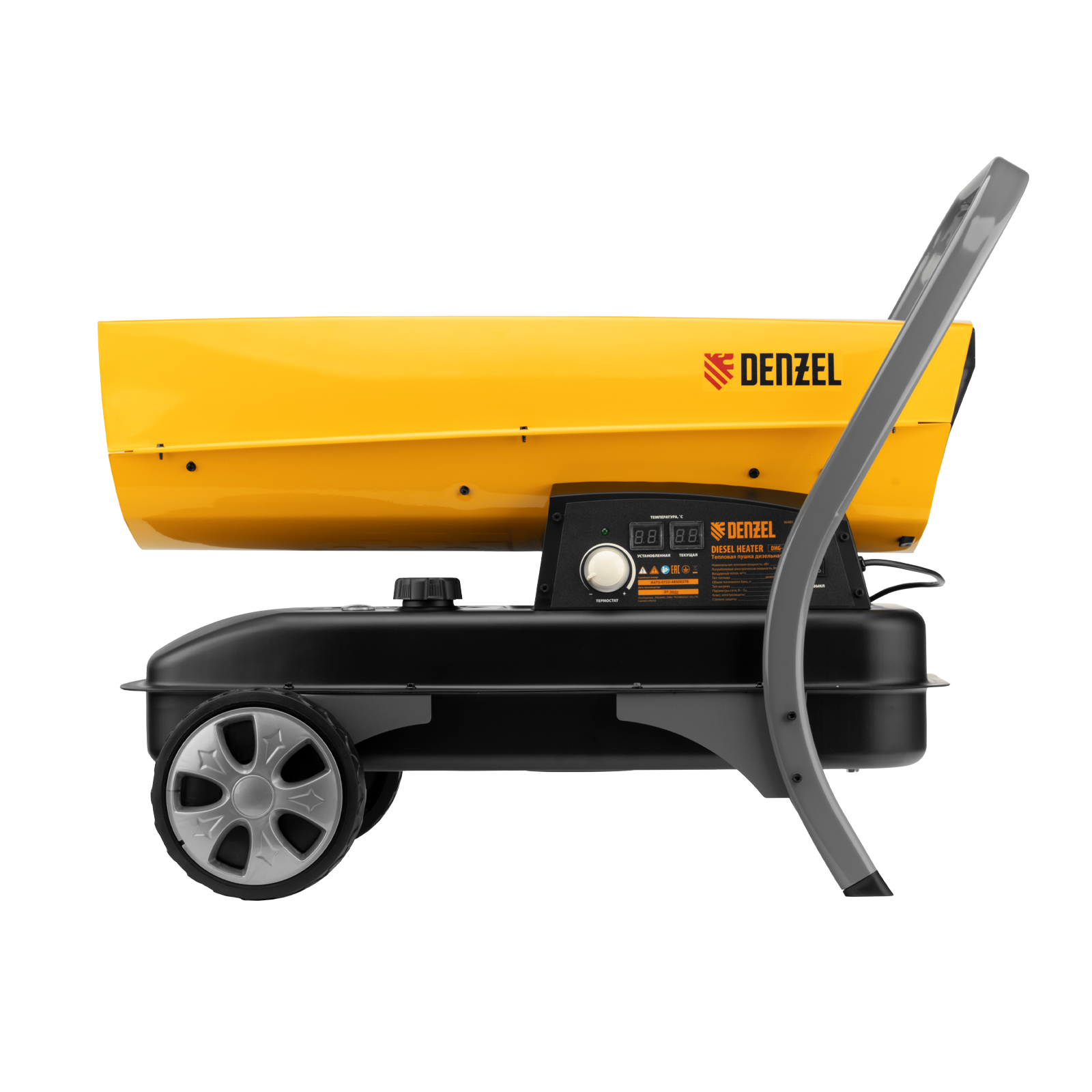 Дизельная тепловая пушка Denzel DHG-45i 96485 номинальной тепловой мощностью 45 кВт и производительностью 1000 куб. м/ч, с прямым типом нагрева, с электронным термостатом, предназначена для обогрева цехов, складов, теплиц и других нежилых помещений. Используется в строительстве и на производстве. Пушка характеризуется низким расходом топлива: полного бака хватает более чем на 9 часов работы. Важно: в обогреваемом помещении необходимо обеспечить хорошую вентиляцию.