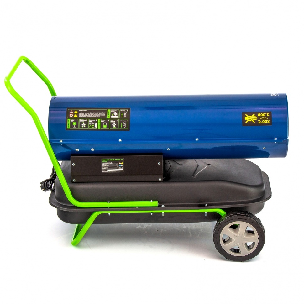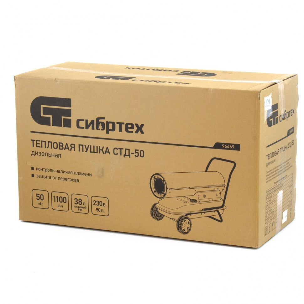 Дизельная тепловая пушка Сибртех СТД-50 96469 мощностью 50 кВт и производительностью 1100 куб. м/ч используется для прямого нагрева воздуха в цехах, хранилищах, ангарах, теплицах и других нежилых помещениях. Также ее используют на строительных площадках для просушивания стен, разморозки траншей, подогрева бетона. Пушка позволяет быстро и эффективно обогреть помещение с объемом воздуха до 1600 куб. м.