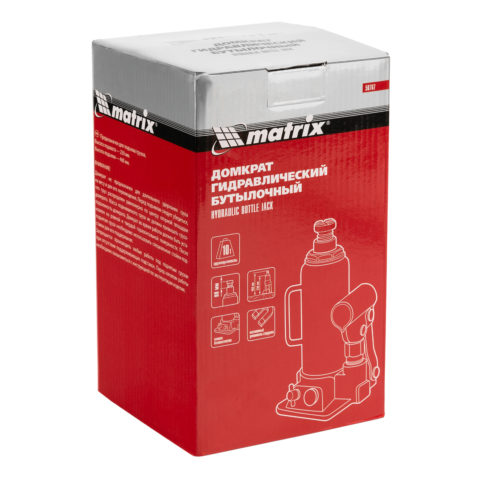 Гидравлический бутылочный домкрат Matrix 50767 предназначен для быстрого поднятия грузов массой до 10 т на высоту 230-460 мм. Будет полезен автолюбителям и мастерам СТО в качестве полупрофессионального инструмента. Встроенный магнитный уловитель металлической стружки защищает резиновые уплотнители от повреждений.