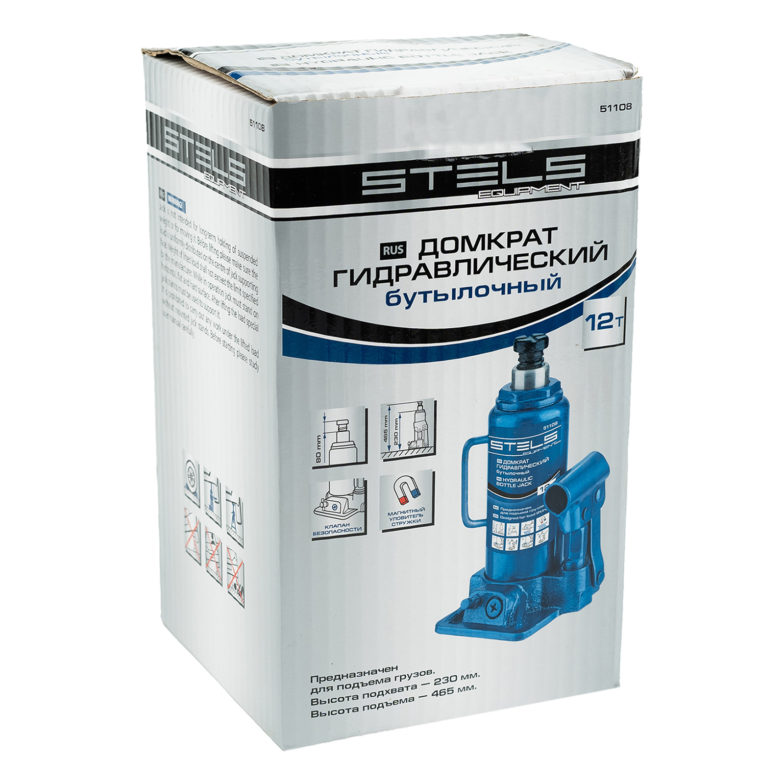 Гидравлический бутылочный домкрат Stels 51108 предназначен для поднятия грузов массой до 12 т на высоту с 230 до 465 мм. Позволяет установить жесткую опору под груз для последующего проведения ремонта. Будет полезен на станции техобслуживания, пригодится во время проведения ремонтно-строительных работ.