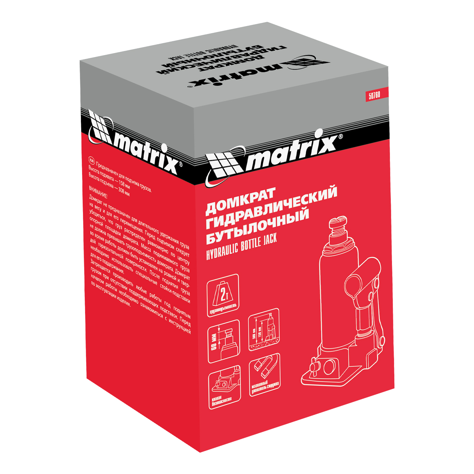Гидравлический бутылочный домкрат Matrix 50760 предназначен для быстрого поднятия грузов массой до 2 т на высоту 158-308 мм. Будет полезен автолюбителям и мастерам СТО в качестве полупрофессионального инструмента. Встроенный магнитный уловитель металлической стружки защищает резиновые уплотнители от повреждений.