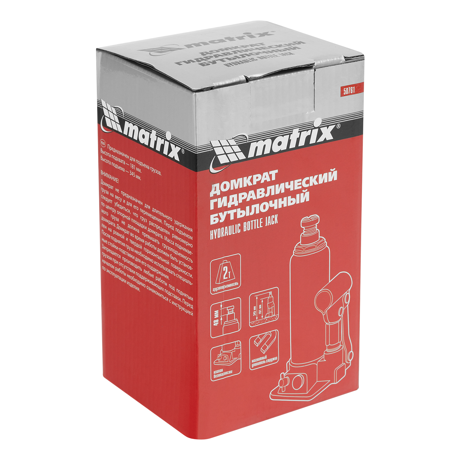 Гидравлический бутылочный домкрат Matrix 50761 предназначен для быстрого поднятия грузов массой до 2 т на высоту 181-345 мм. Будет полезен автолюбителям и мастерам СТО в качестве полупрофессионального инструмента. Встроенный магнитный уловитель металлической стружки защищает резиновые уплотнители от повреждений.