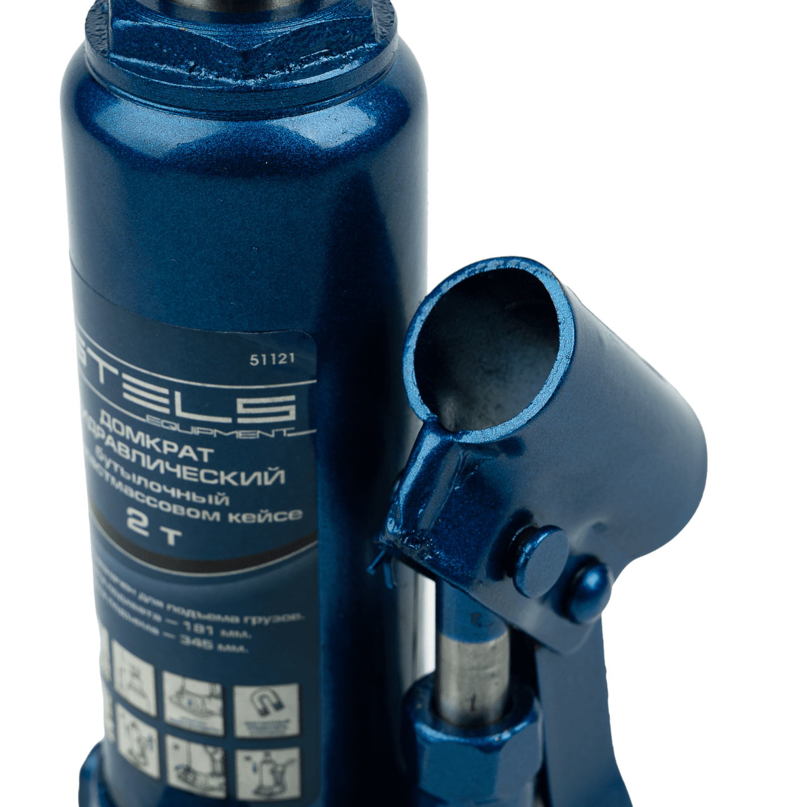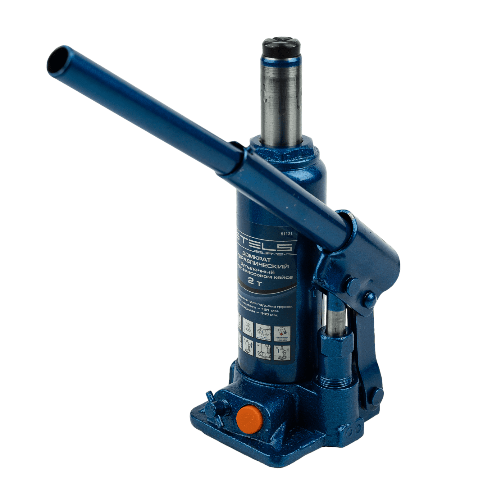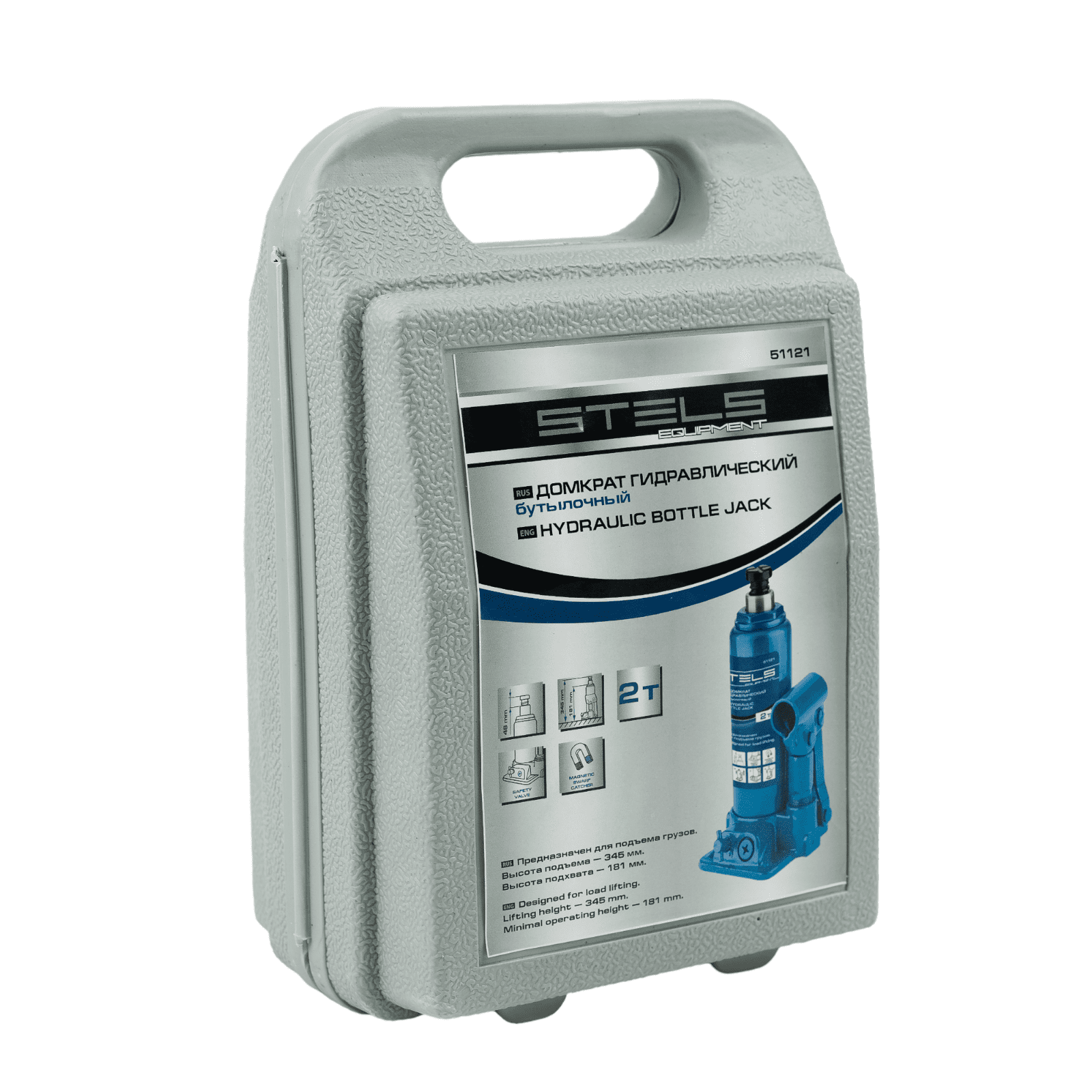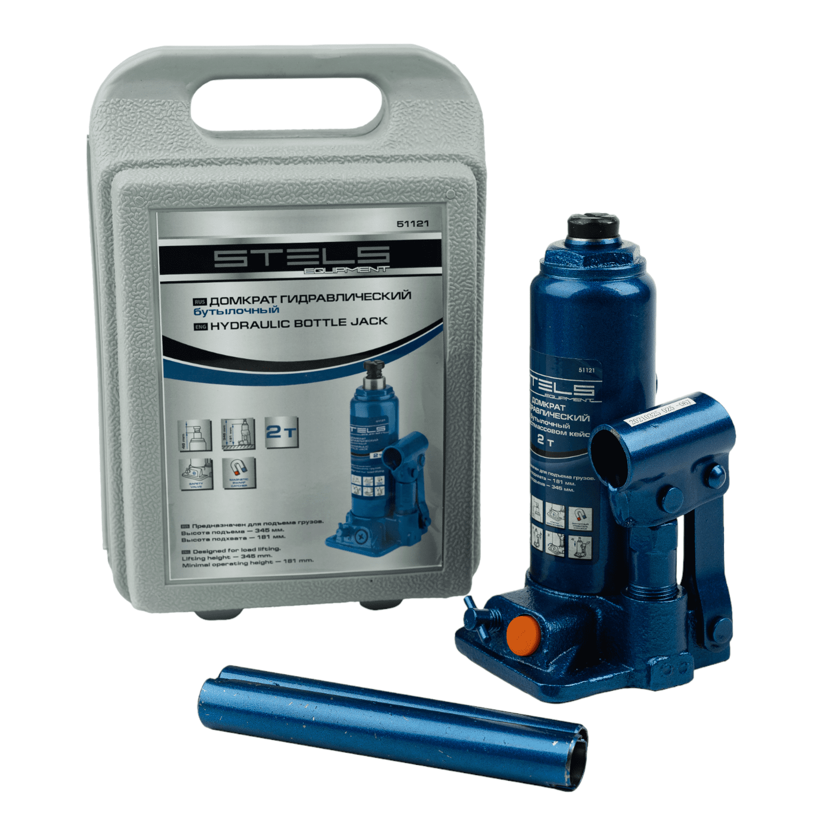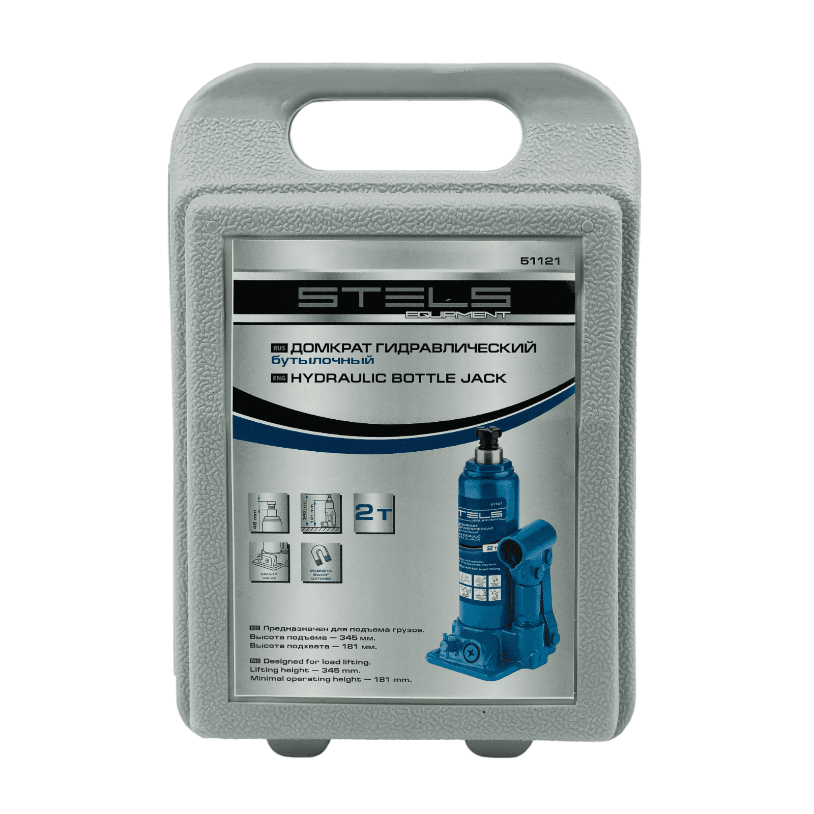 Гидравлический бутылочный домкрат Stels 51121, поставляющийся в пластиковом кейсе, предназначен для поднятия грузов массой до 2 т на высоту со 181 до 345 мм. Позволяет установить жесткую опору под груз для последующего проведения ремонта. Будет полезен на станции техобслуживания, подойдет также для самостоятельного обслуживания автомобиля. Пригодится во время проведения ремонтно-строительных работ.