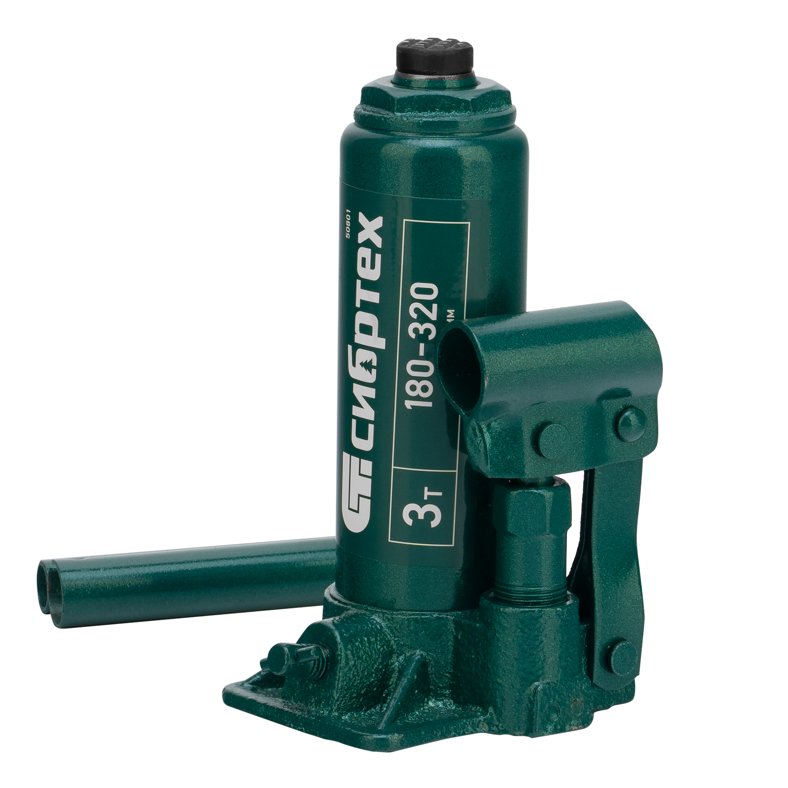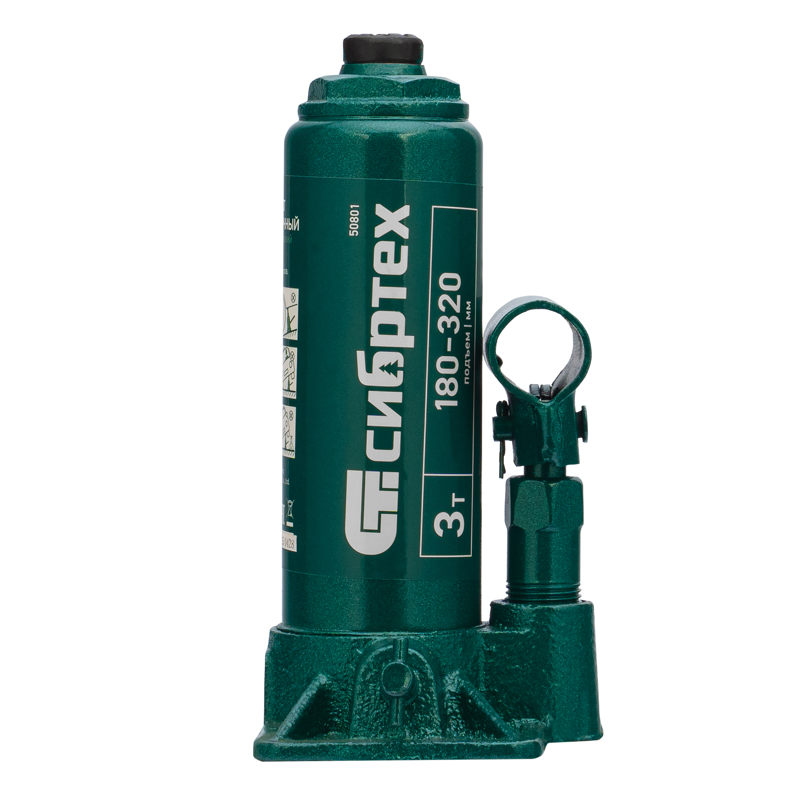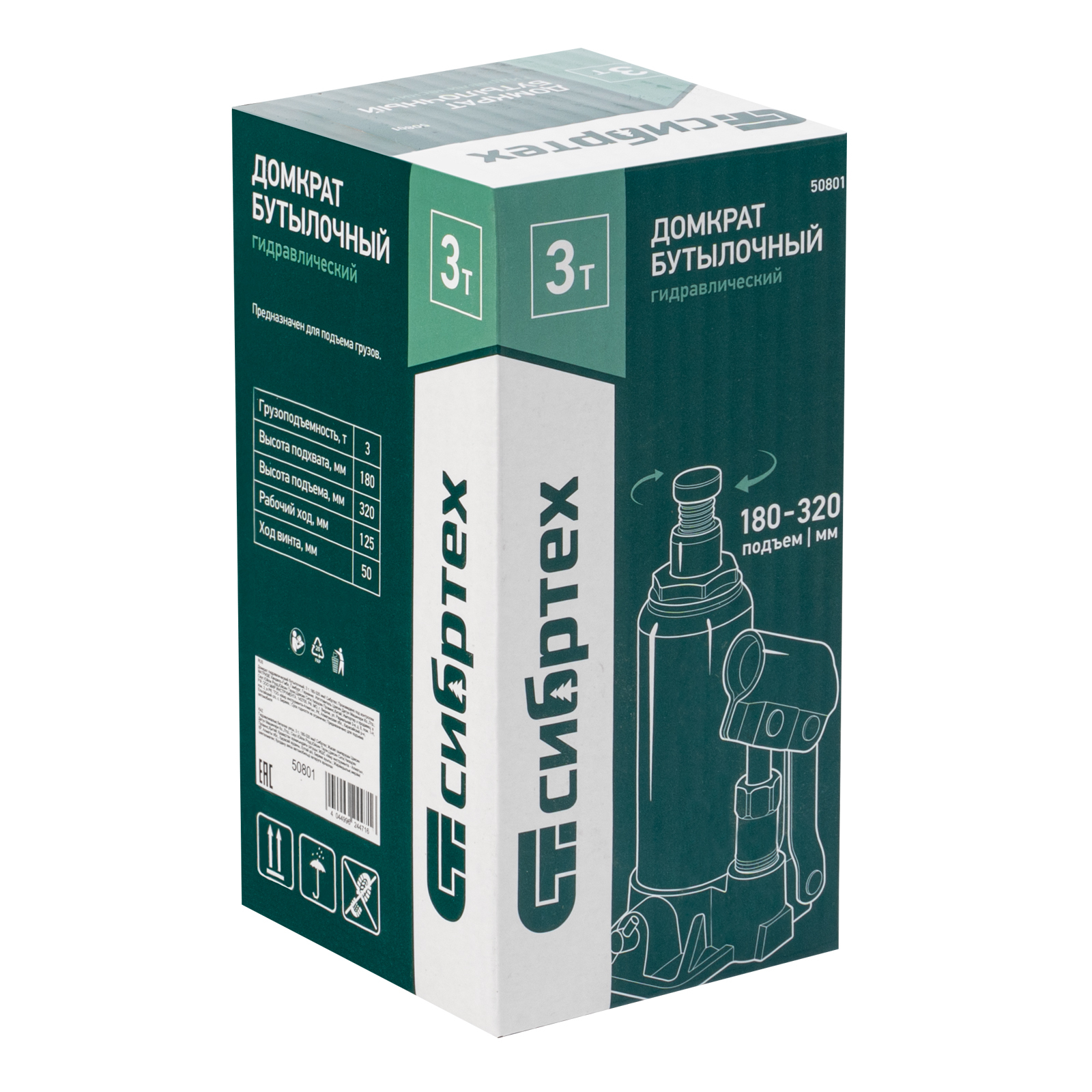 Домкрат гидравлический бутылочный Сибртех 50801 предназначен для подъема грузов массой до 3 т на высоту от 180 до 320 мм. Не требует больших усилий от пользователя и значительно облегчает рабочий процесс. Домкрат будет полезен при проведении техобслуживания машины в автосервисе или гараже.