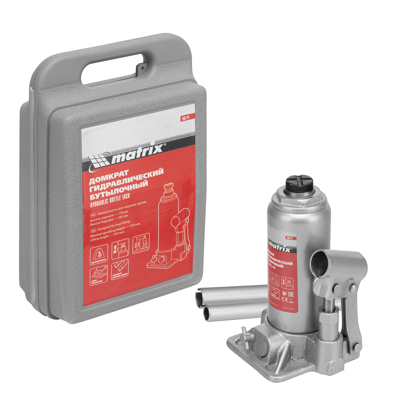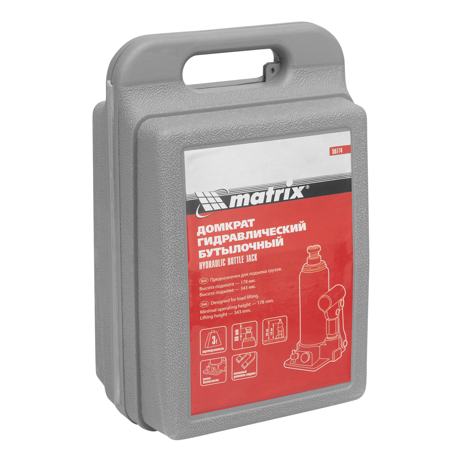 Гидравлический бутылочный домкрат Matrix 50774 позволяет быстро поднимать грузы массой до 3 т на высоту 178-343 мм. Встроенный магнитный уловитель собирает металлическую стружку, предотвращая преждевременный износ резиновых уплотнителей. Домкрат пригодится для полупрофессионального применения.