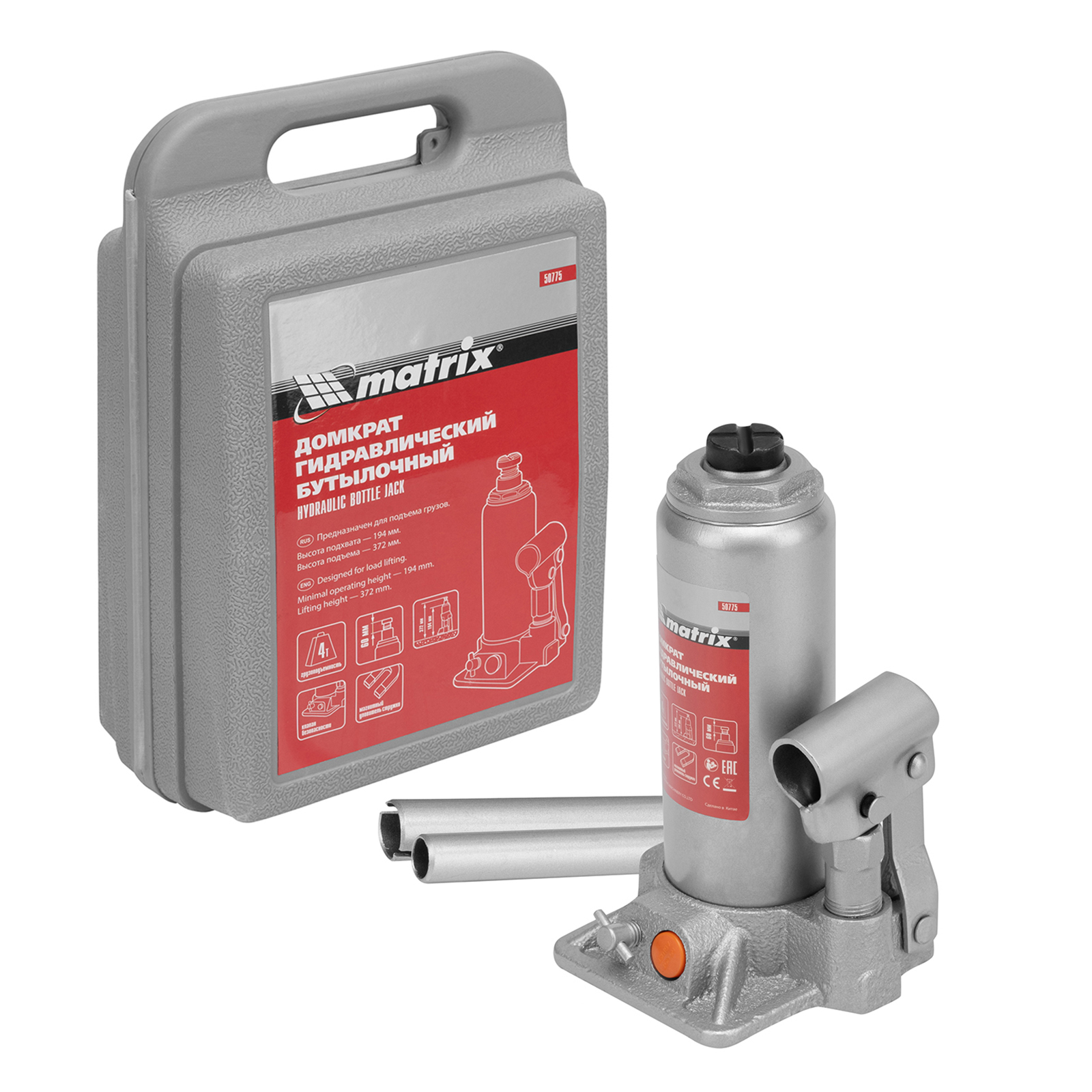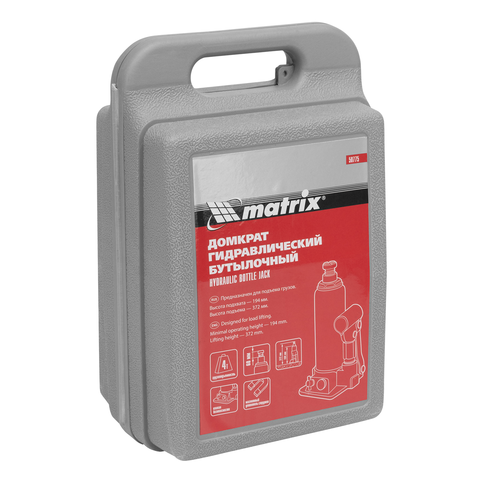 Гидравлический бутылочный домкрат Matrix 50775 позволяет быстро поднимать грузы массой до 4 т на высоту 194-372 мм. Встроенный магнитный уловитель собирает металлическую стружку, предотвращая преждевременный износ резиновых уплотнителей. Домкрат пригодится для полупрофессионального применения.