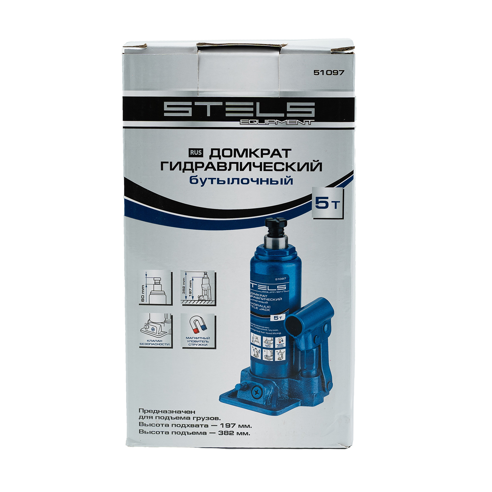 Гидравлический бутылочный домкрат Stels 51097 предназначен для поднятия грузов массой до 5 т на высоту со 197 до 382 мм. Позволяет установить жесткую опору под груз для последующего проведения ремонта. Будет полезен на станции техобслуживания, подойдет также для самостоятельного обслуживания автомобиля. Пригодится во время проведения ремонтно-строительных работ.