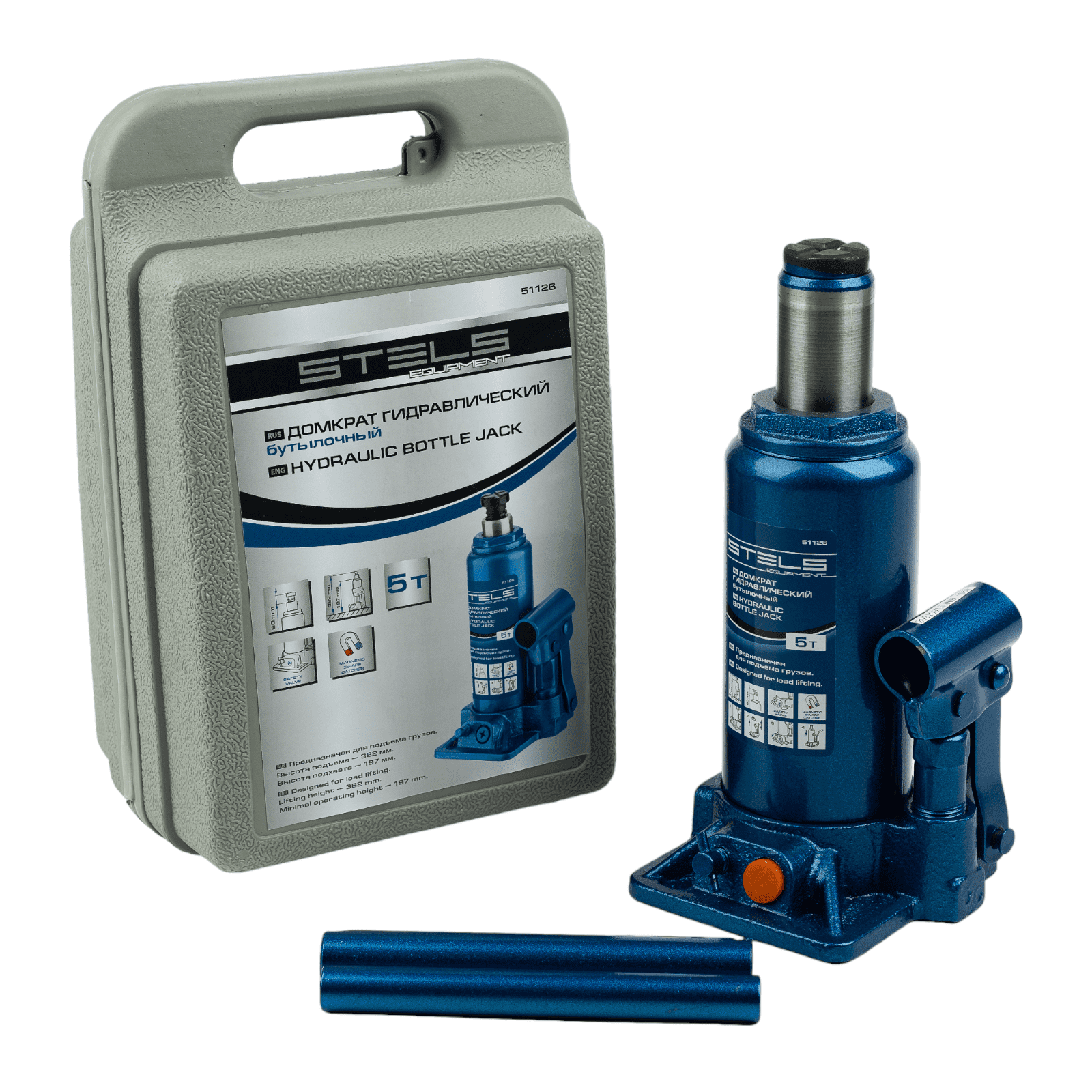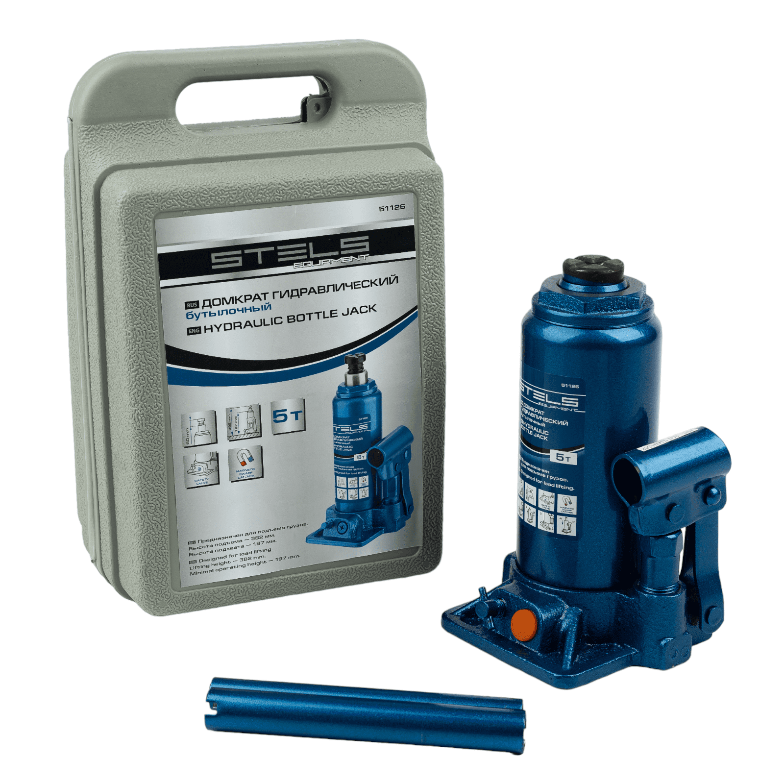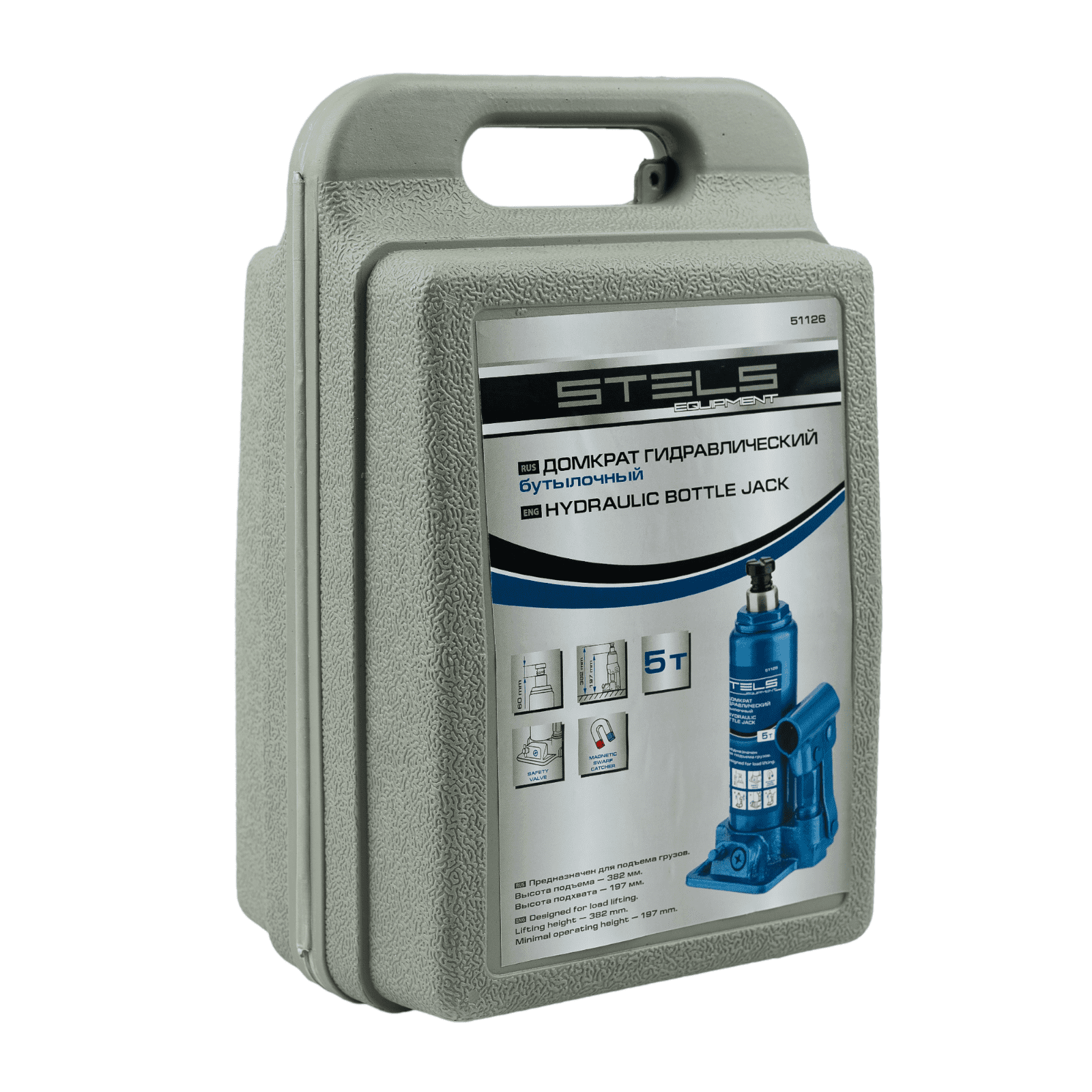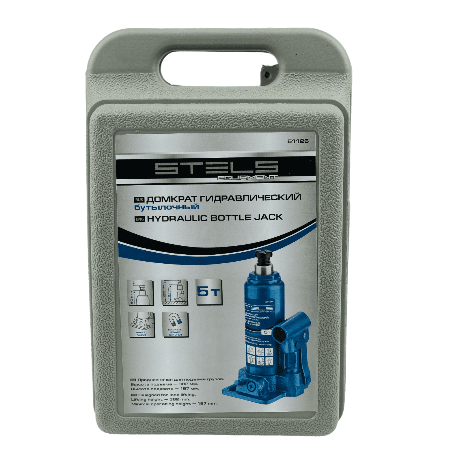 Гидравлический бутылочный домкрат Stels 51126, поставляющийся в пластиковом кейсе, предназначен для поднятия грузов массой до 5 т на высоту со 197 до 382 мм. Позволяет установить жесткую опору под груз для последующего проведения ремонта. Будет полезен на станции техобслуживания, подойдет также для самостоятельного обслуживания автомобиля. Пригодится во время проведения ремонтно-строительных работ.
