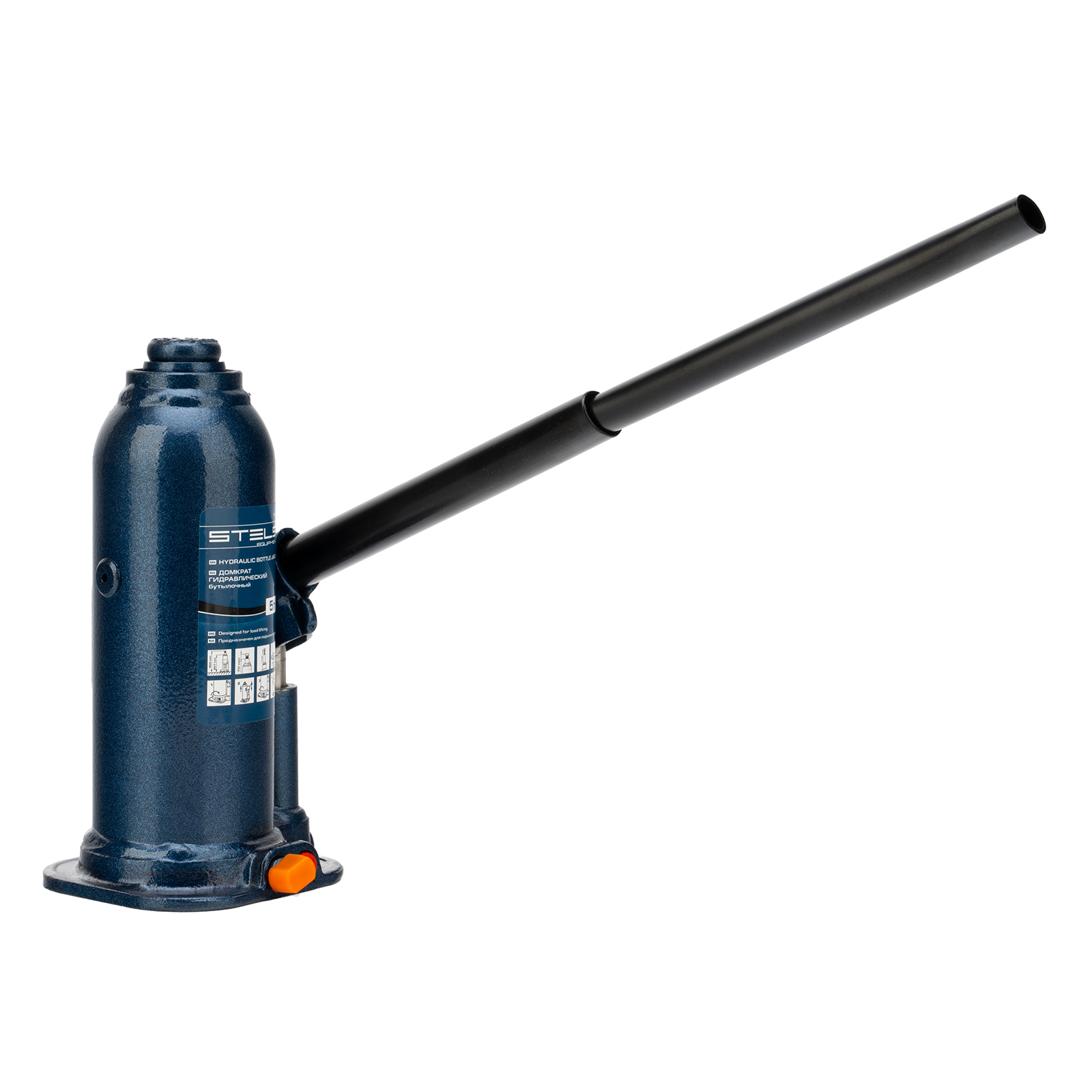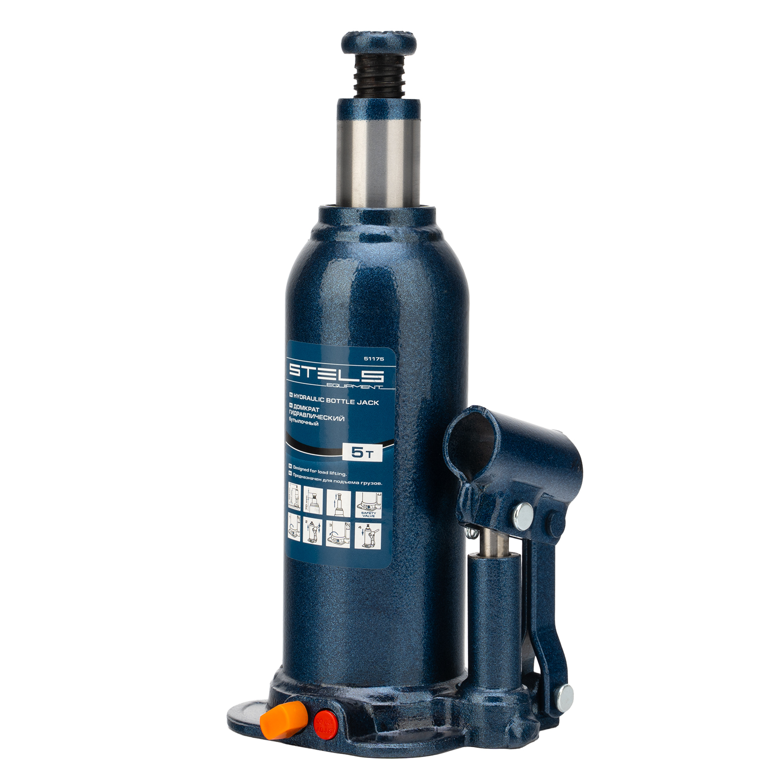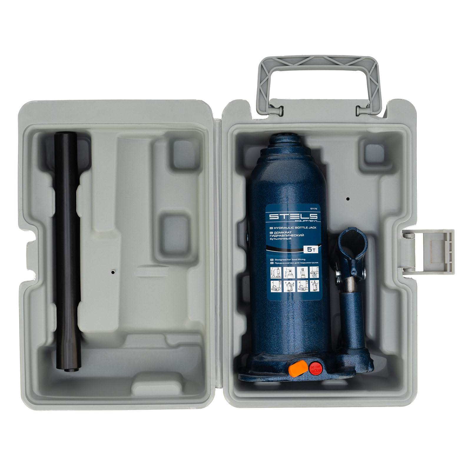 Гидравлический бутылочный домкрат Stels 51175 в пластиковом кейсе предназначен для поднятия грузов весом до 5 т на высоту 207-404 мм. Он не занимает много места и легко помещается в багажник, поэтому его можно брать с собой в дорогу или хранить в гараже. Используется для самостоятельного ремонта авто, также подходит для профессионального применения на станциях технического обслуживания.