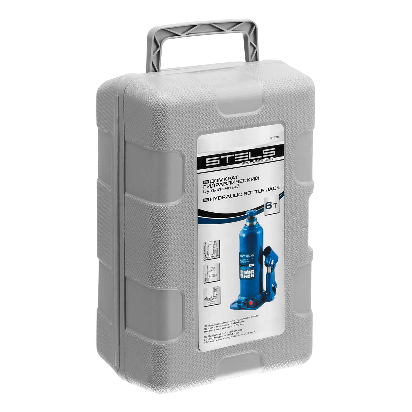 Гидравлический бутылочный домкрат Stels 51176 в пластиковом кейсе предназначен для поднятия грузов весом до 6 т на высоту 207-404 мм. Он не занимает много места и легко помещается в багажник, поэтому его можно брать с собой в дорогу или хранить в гараже. Используется для самостоятельного ремонта авто, также подходит для профессионального применения на станциях технического обслуживания.