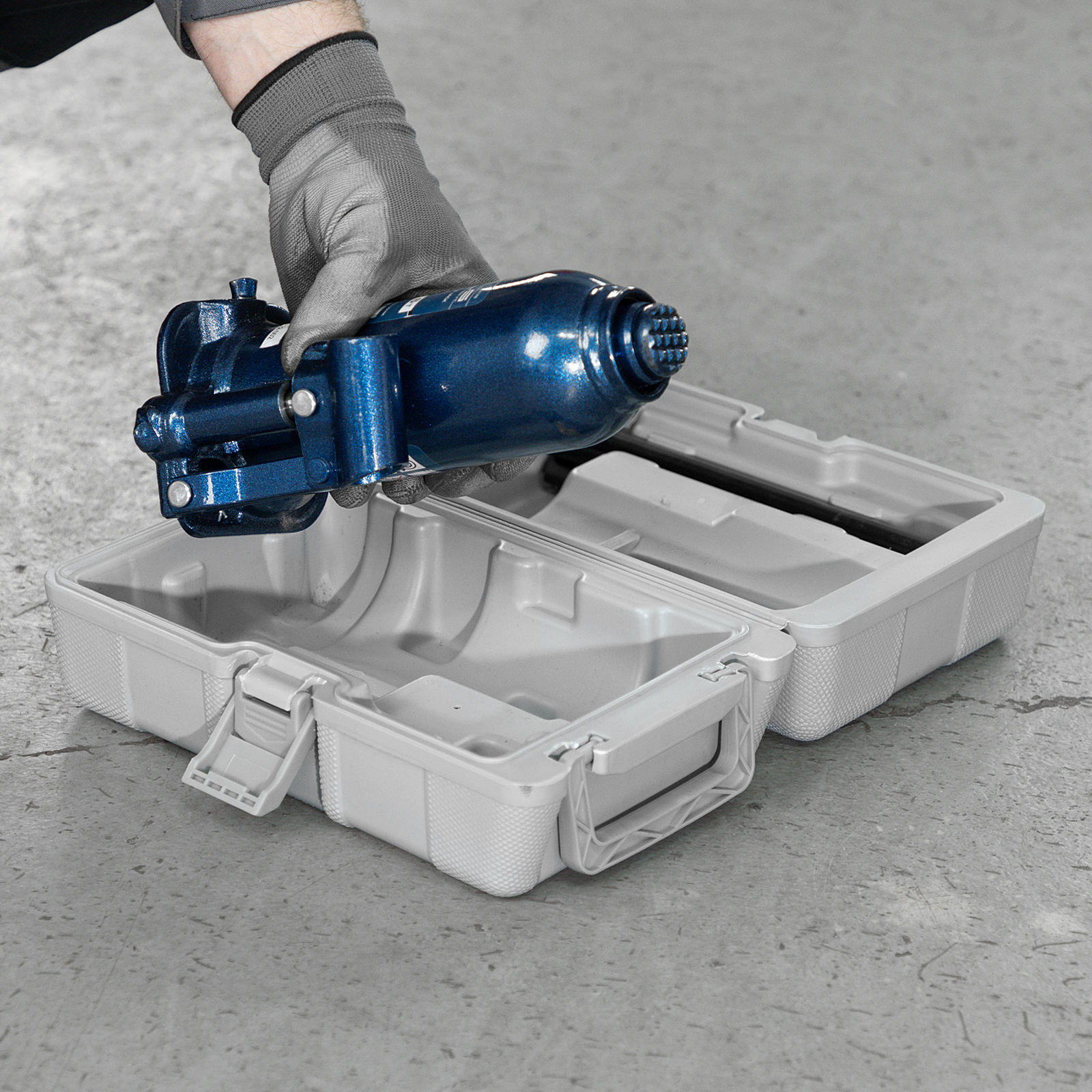 - Удобное хранение и транспортировка — домкрат поставляется в пластиковом кейсе.