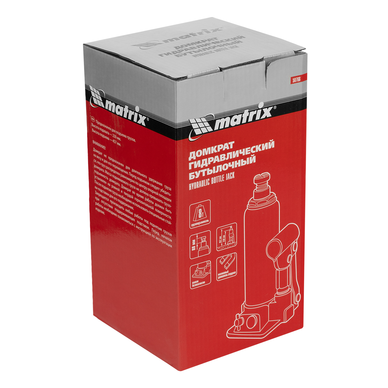 Гидравлический бутылочный домкрат Matrix 50766 предназначен для быстрого поднятия грузов массой до 8 т на высоту 230-457 мм. Будет полезен автолюбителям и мастерам СТО в качестве полупрофессионального инструмента. Встроенный магнитный уловитель металлической стружки защищает резиновые уплотнители от повреждений.