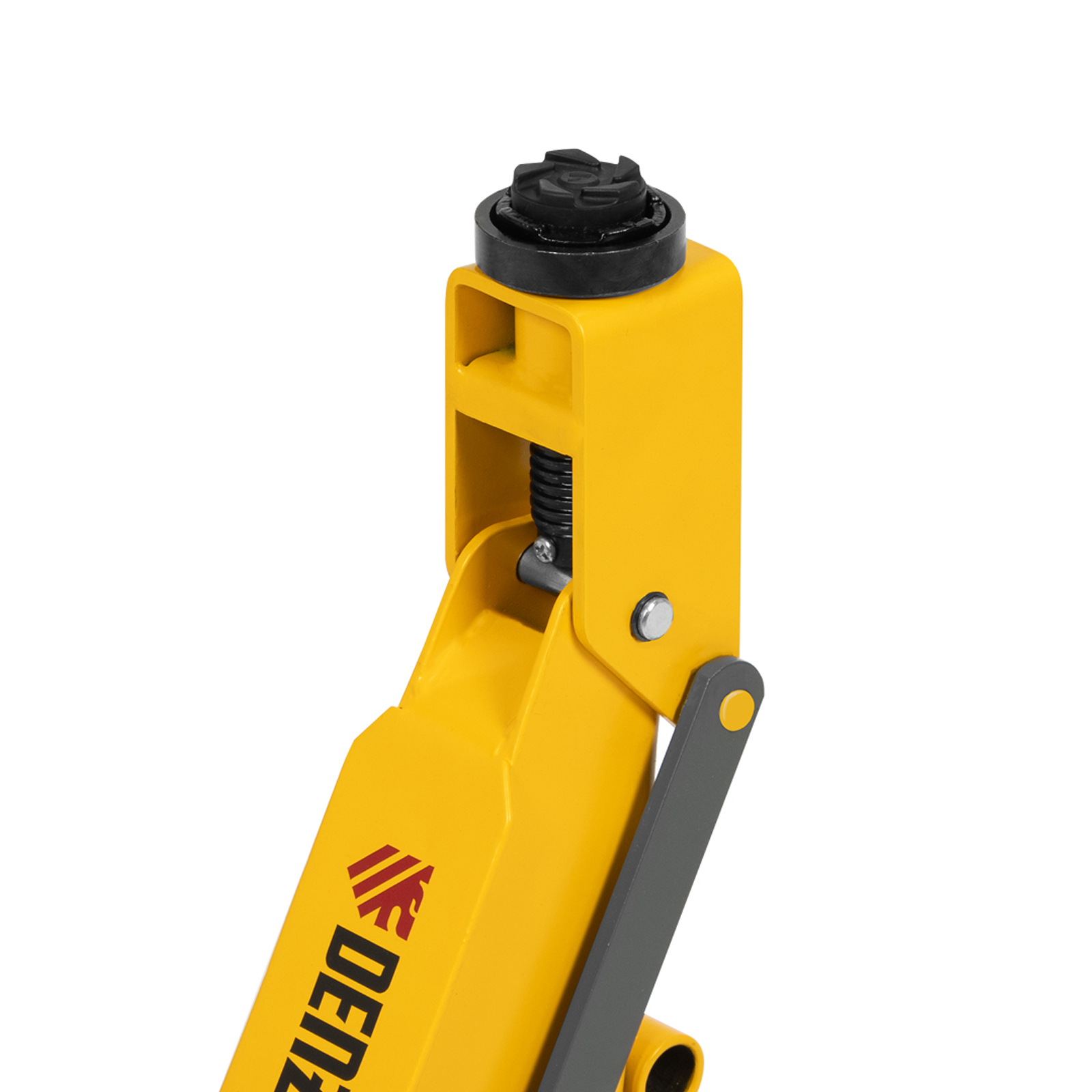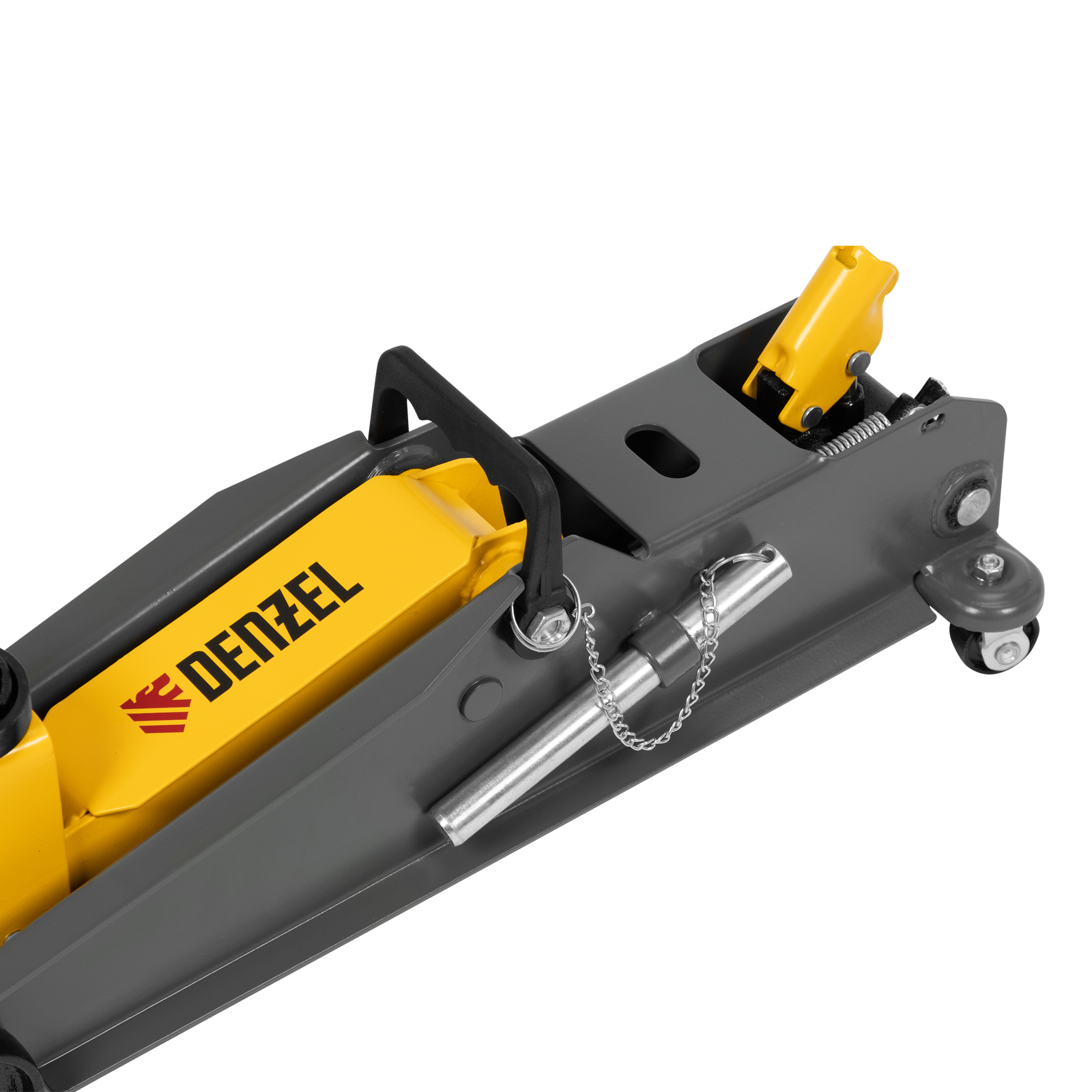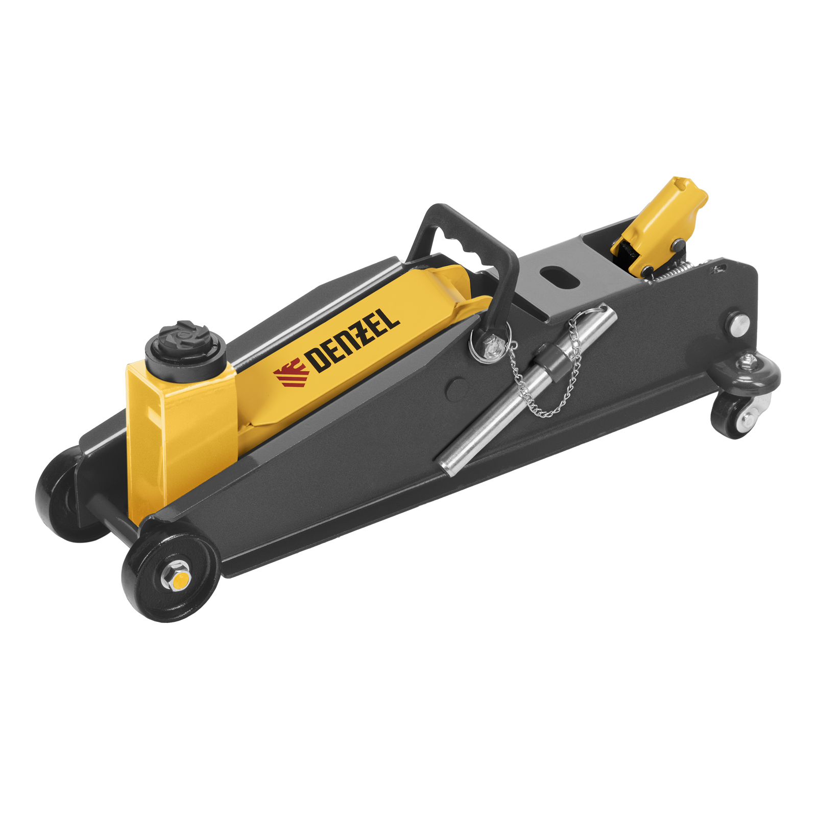 Гидравлический подкатной домкрат Denzel 51261 с фиксатором имеет высоту подхвата 190 мм и предназначен для плавного подъема грузов массой до 3 т (в том числе автомобилей класса SUV) на высоту до 532 мм. Страховочный штифт позволяет фиксировать подъемный рычаг на высоте 410 и 450 мм для безопасной работы. Домкрат пригодится владельцам легковых автомобилей со стандартным клиренсом.