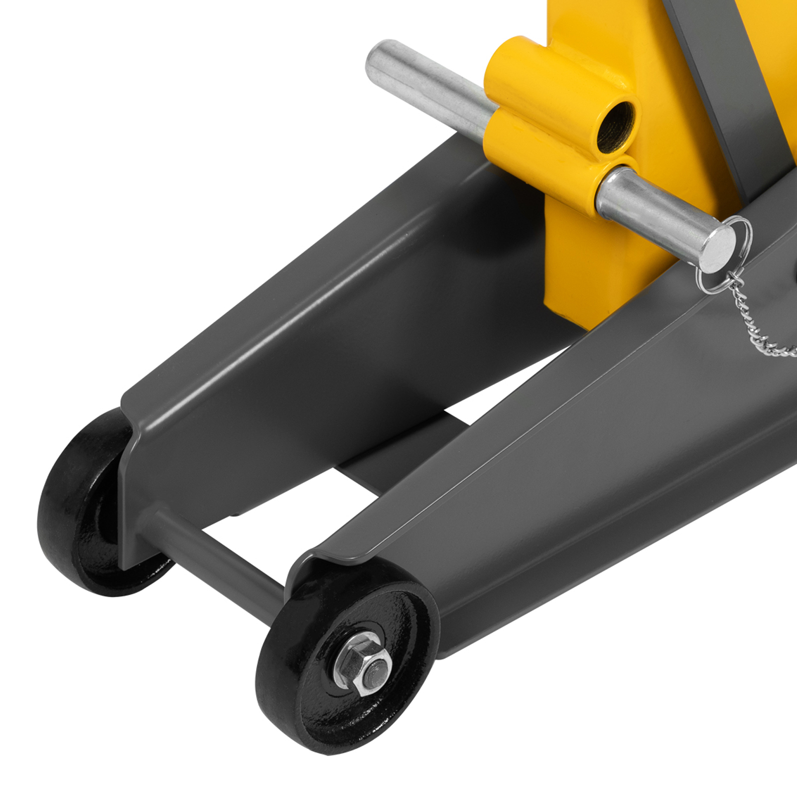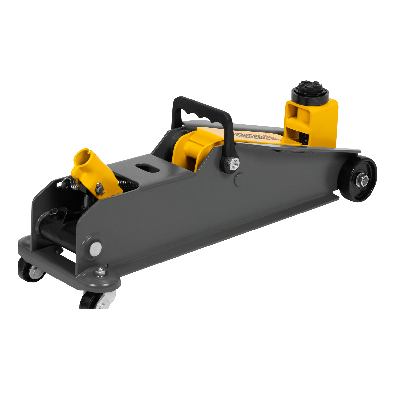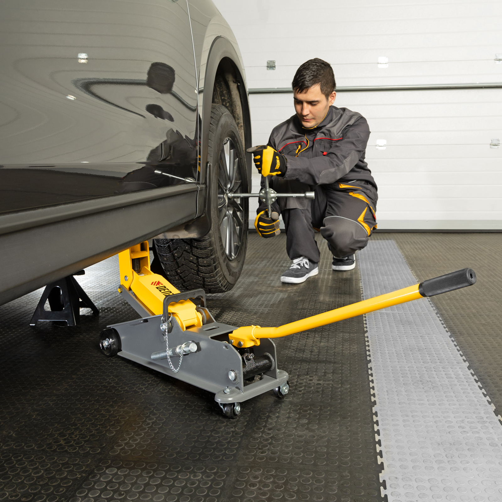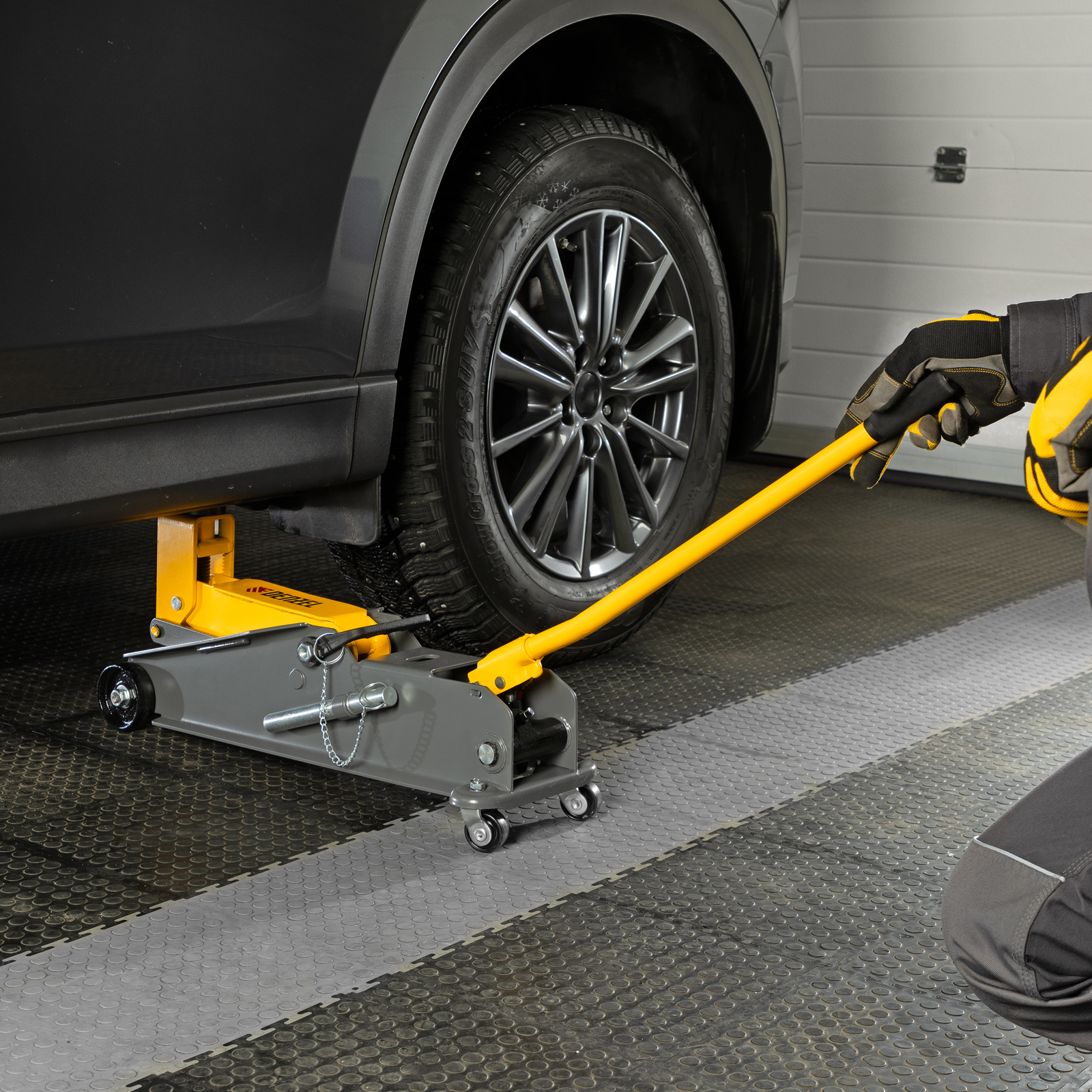 Гидравлический подкатной домкрат Denzel 51261 с фиксатором имеет высоту подхвата 190 мм и предназначен для плавного подъема грузов массой до 3 т (в том числе автомобилей класса SUV) на высоту до 532 мм. Страховочный штифт позволяет фиксировать подъемный рычаг на высоте 410 и 450 мм для безопасной работы. Домкрат пригодится владельцам легковых автомобилей со стандартным клиренсом.