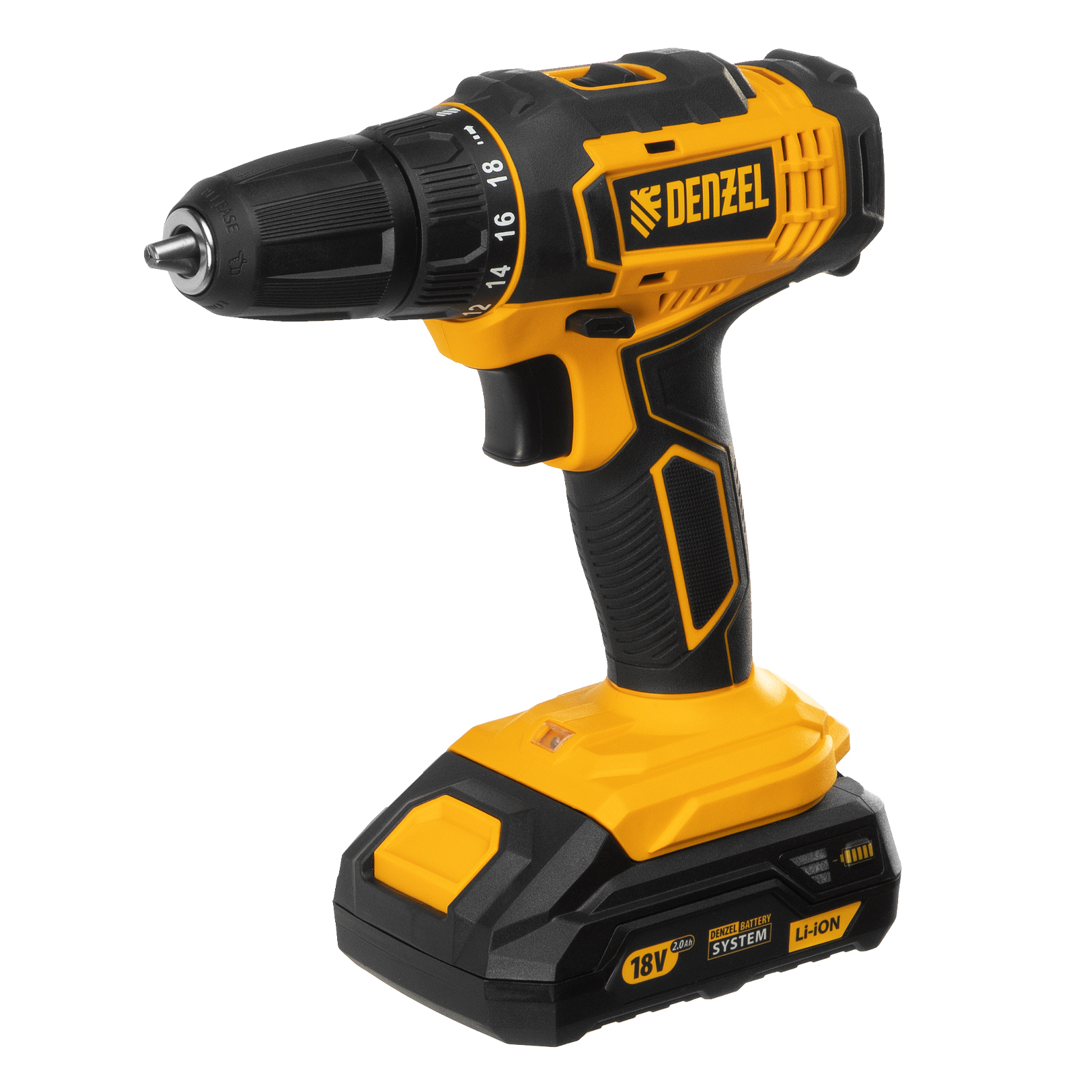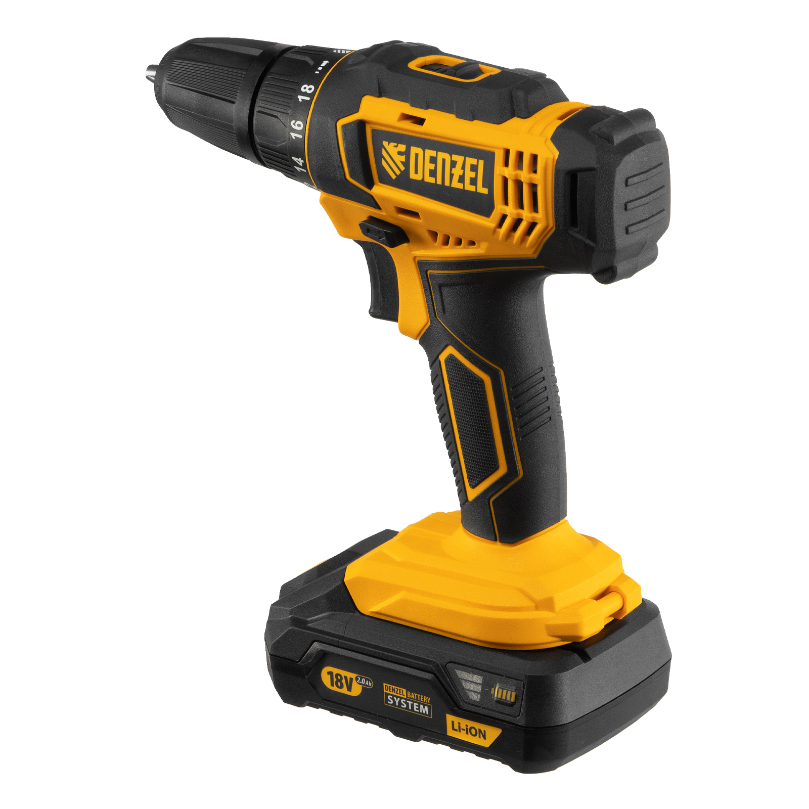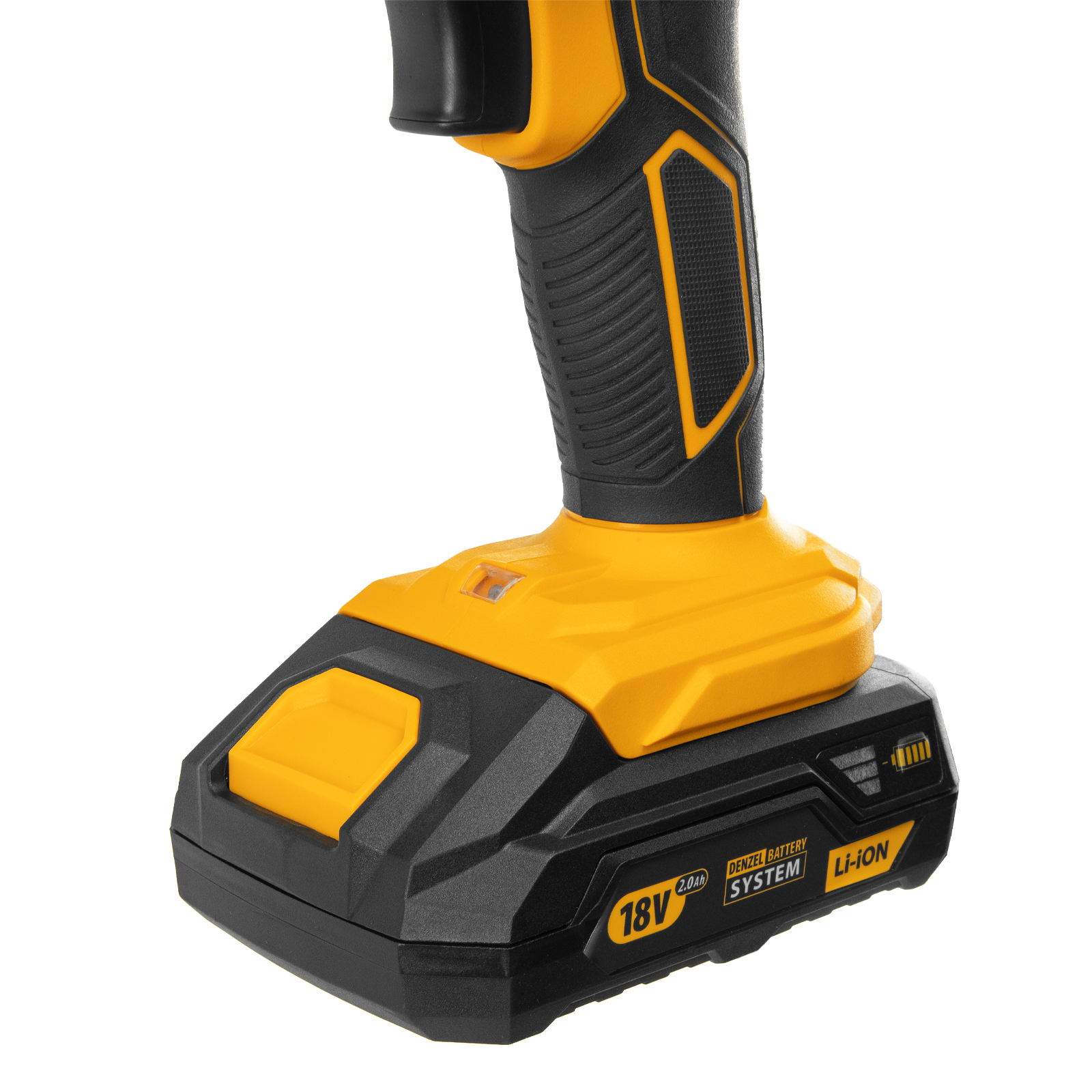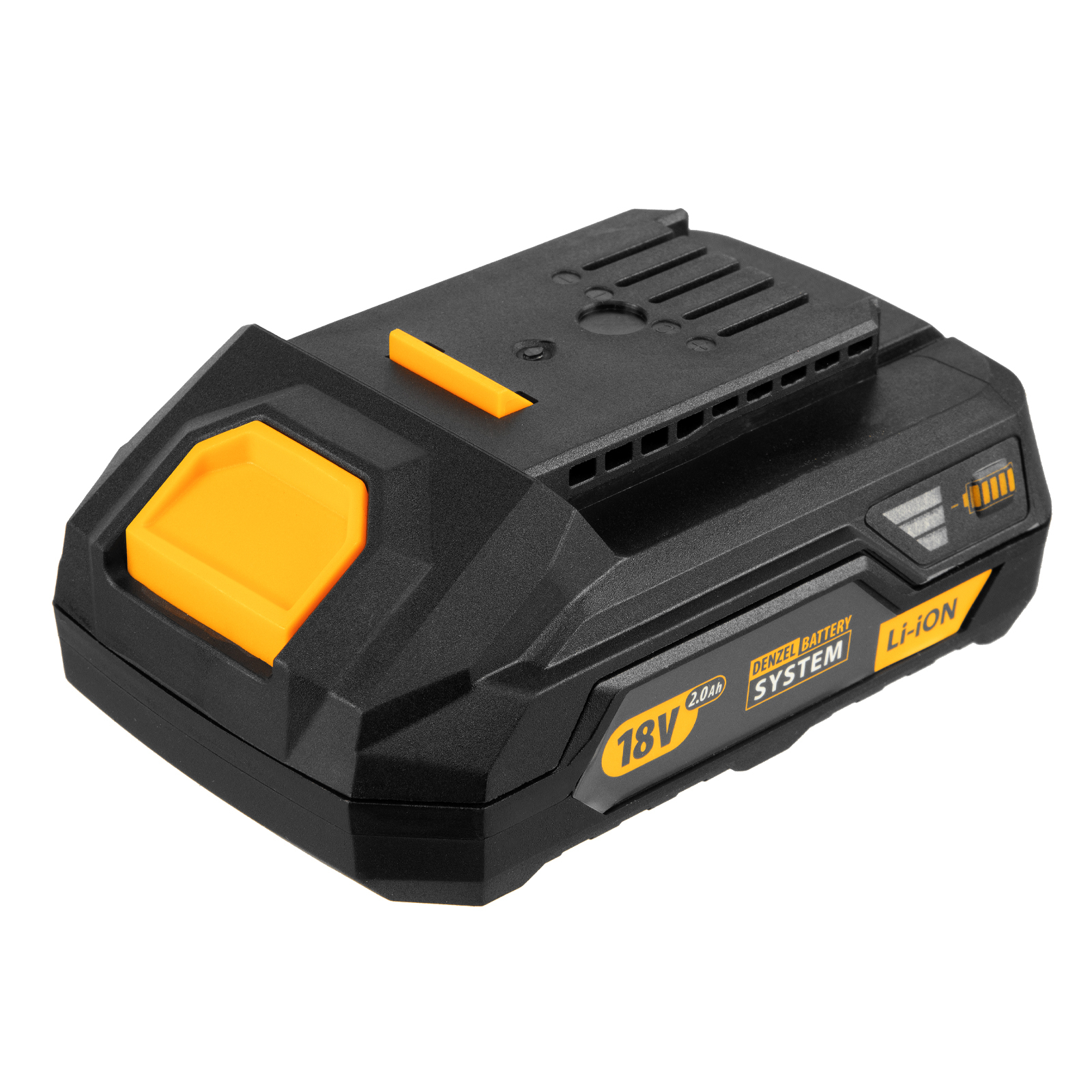 - Универсальность — аккумуляторные батареи Li-ion емкостью 2 Ач совместимы с любым инструментом из модельного ряда единой платформы Denzel Battery System 18V.