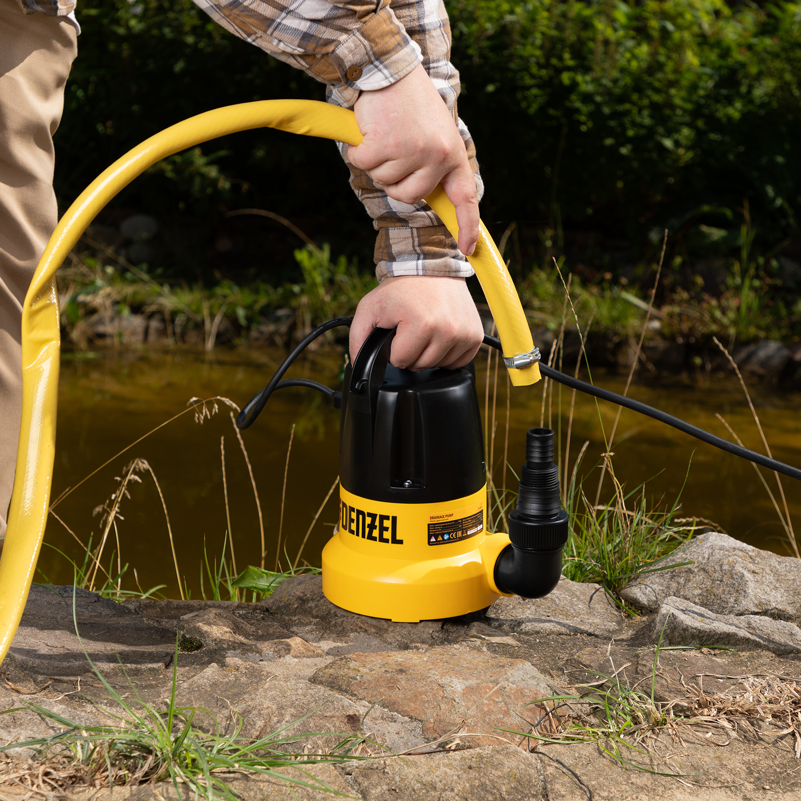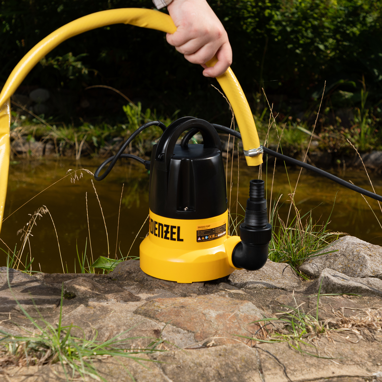 Дренажный насос Denzel DP500E 97218 мощностью 500 Вт обеспечивает высоту подъема 7 м и производительность 7000 л/ч. Используется для подачи чистой воды из колодцев и организации систем полива.