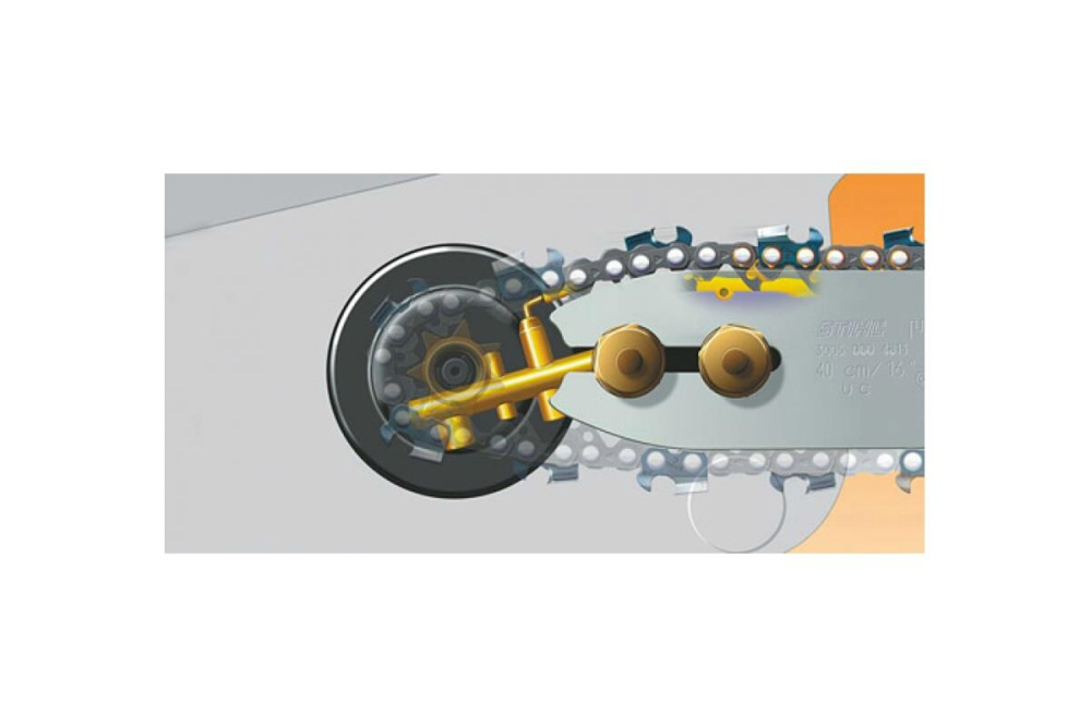 Безопасность. Тормоз пильной цепи предотвращает травмирование пользователя в случае отскока.