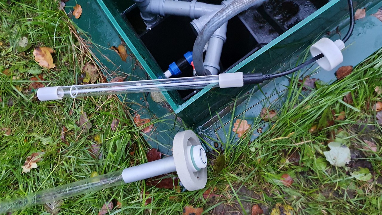 Модуль состоит из УФ лампы, защитного кварцевого чехла и блока питания от сети 220В переменного тока. Вставляется в самотечный переток между последним отстойником и самотечным выпуском очищенной воды, либо камерой принудительной откачки воды насосом.