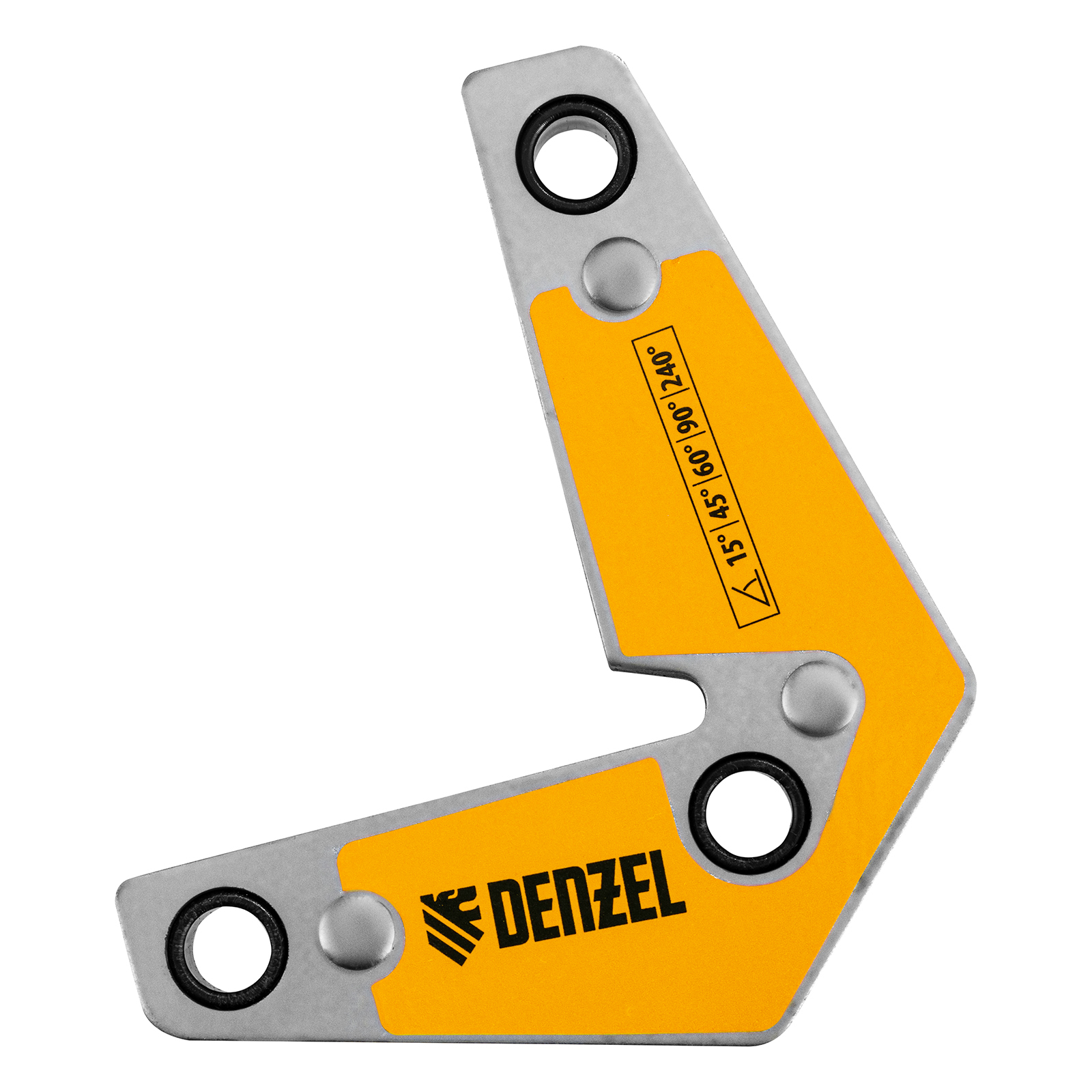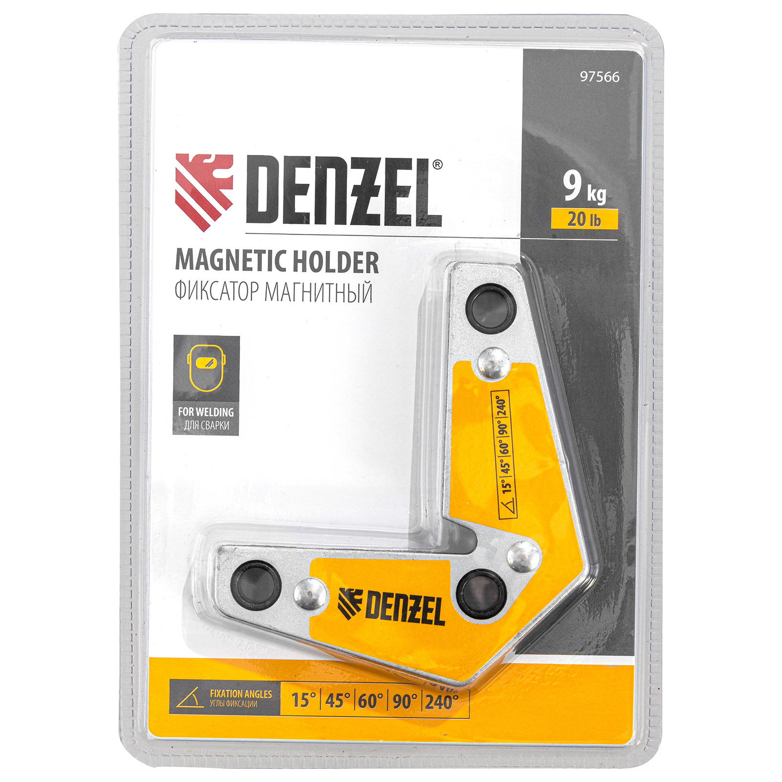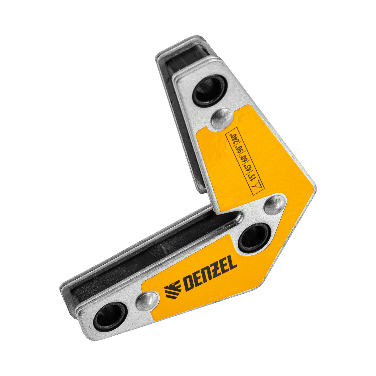 Магнитный фиксатор Denzel 97566 выдерживает усилие 25 LB (10 кг), позволяет соединять металлические детали под углом 30°, 45°, 60°, 75°, 90° и 135° и используется при проведении сварочных работ.