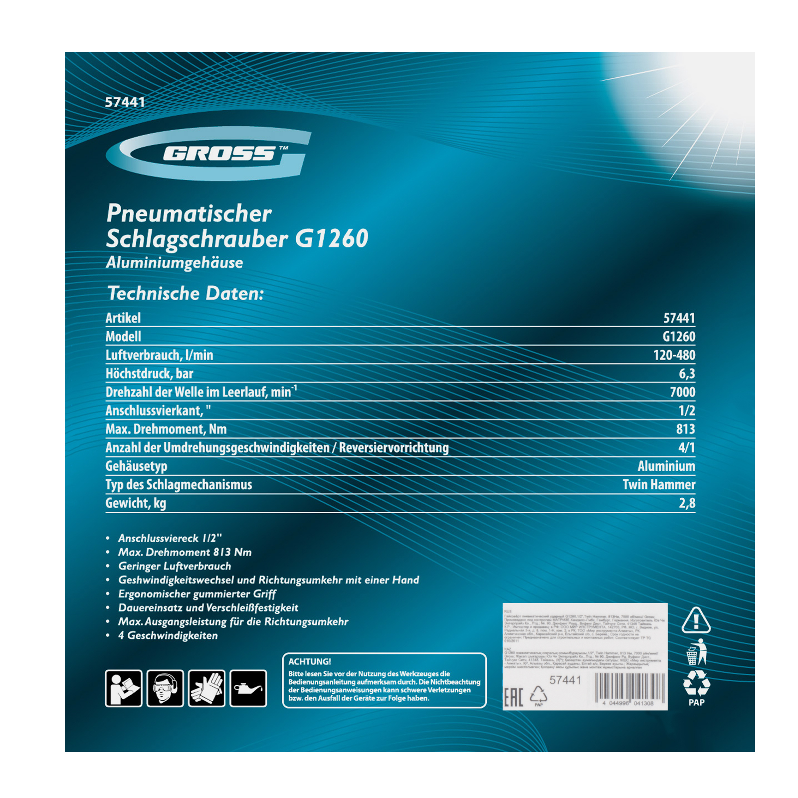 Пневматический гайковерт Gross G1260 57441 с ударным механизмом Twin Hammer и присоединительным квадратом 1/2″, с максимальным крутящим моментом 813 Нм и частотой вращения шпинделя 7000 об/мин, применяется для закручивания и выкручивания резьбового крепежа. Подходит для решения сложных задач и легко справляется с заржавевшими и закисшими болтами. Гайковерт выдерживает интенсивное использование в автомастерской и сборочном цехе.