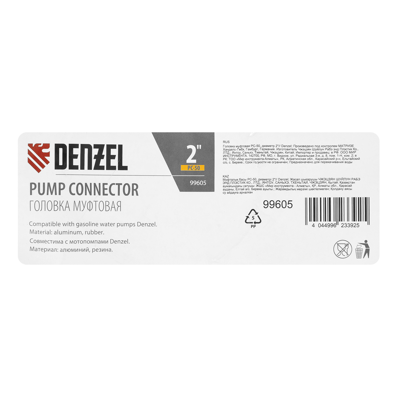 Муфтовая головка Denzel PC-50 99605 с присоединительным диаметром 2" предназначена для соединения выходного патрубка мотопомпы с напорным рукавом. Подходит к моделям Denzel 99201 и 99203. Используется для организации систем полива, водоснабжения, пожаротушения.