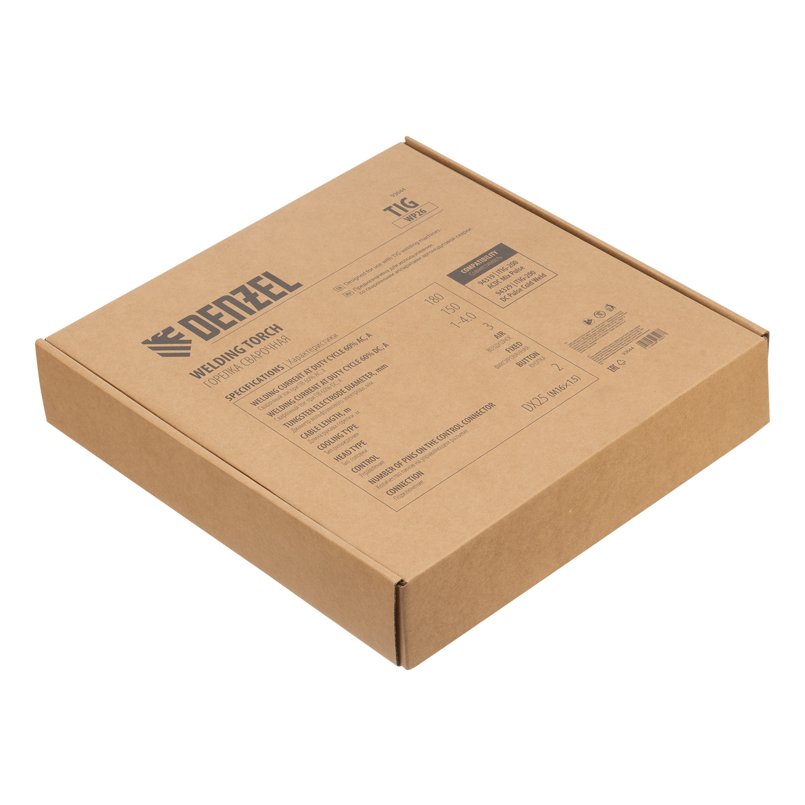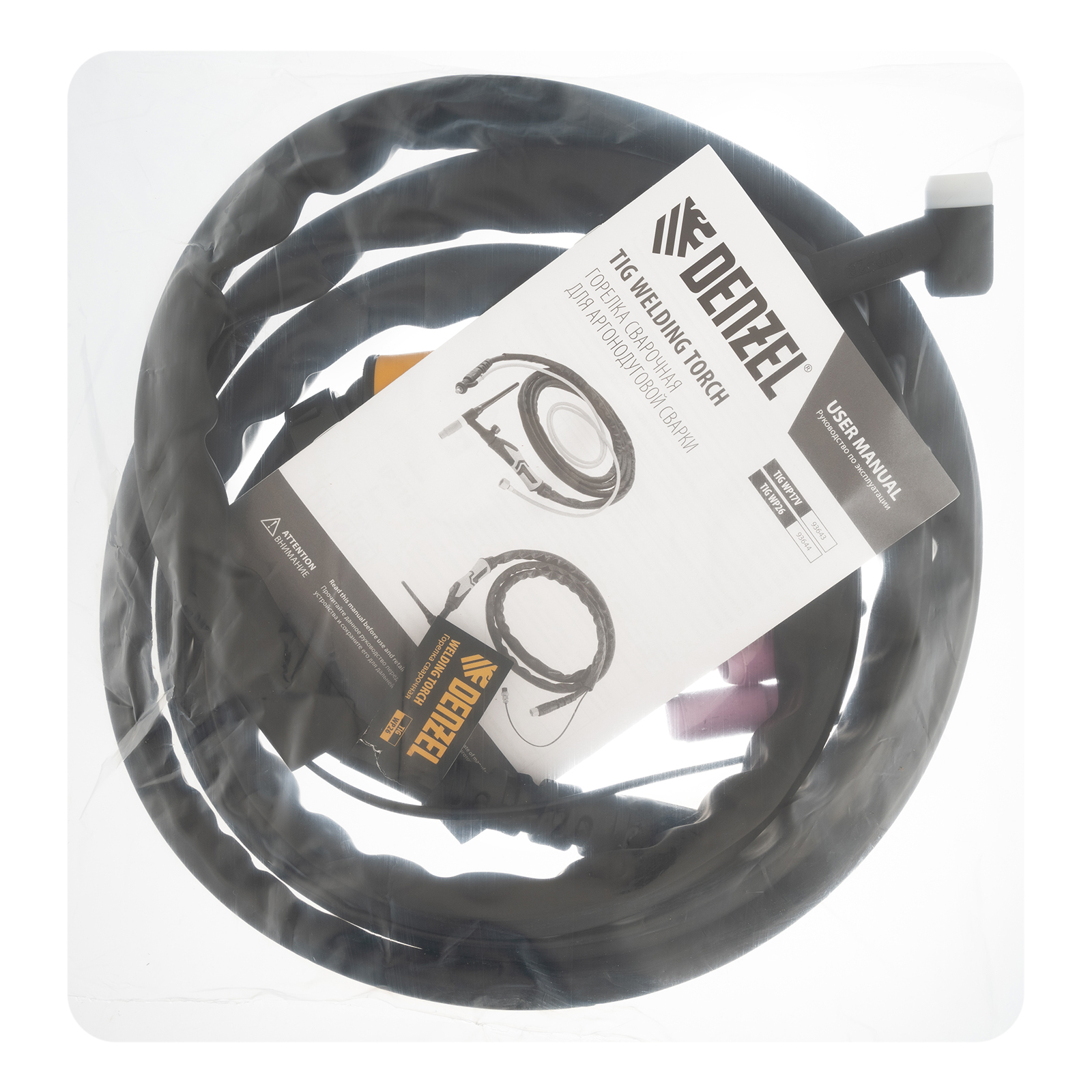 Сварочная горелка Denzel TIG WP26 93644 с рукавом длиной 3 м и управляющим разъемом на 2 пина используется для аргонодуговой сварки неплавящимся электродом диаметром 1-4 мм. Максимальная величина постоянного сварочного тока составляет 180 A, переменного — 150 A. Горелка подходит для работы со сталями и цветными металлами, в т.ч. алюминием.