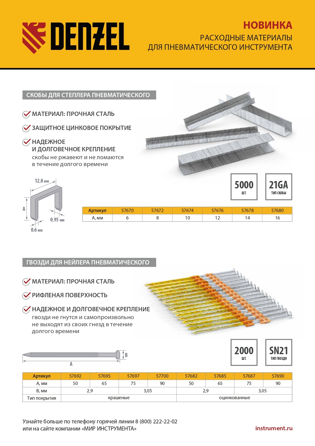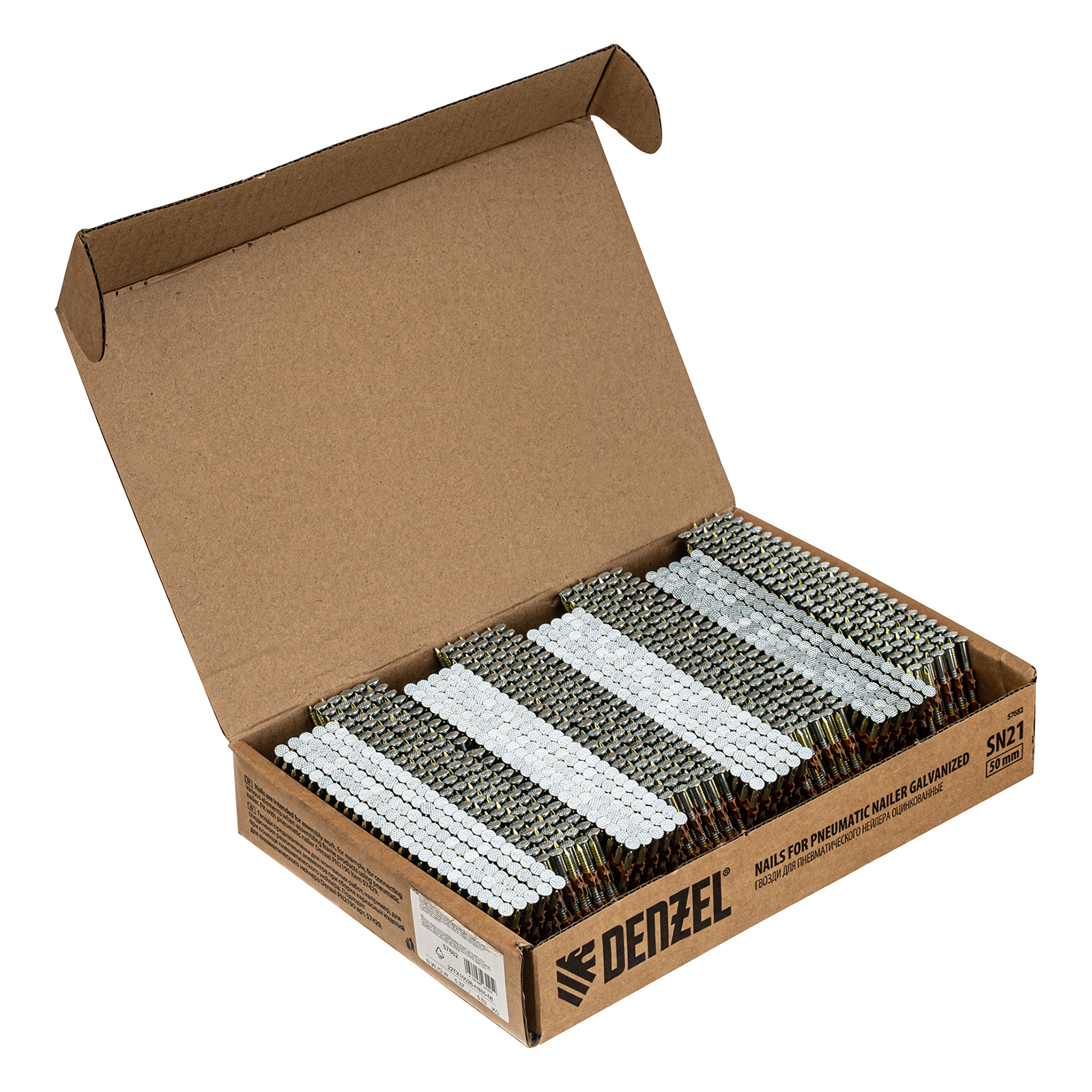 Оцинкованные гвозди Denzel 57682 типа SN21, длиной 50 мм и диаметром 2,9 мм, 2000 шт. в упаковке, — расходники для пневматического нейлера. Используются для скрепления различных материалов, будут полезны во время сборочных и отделочных работ.