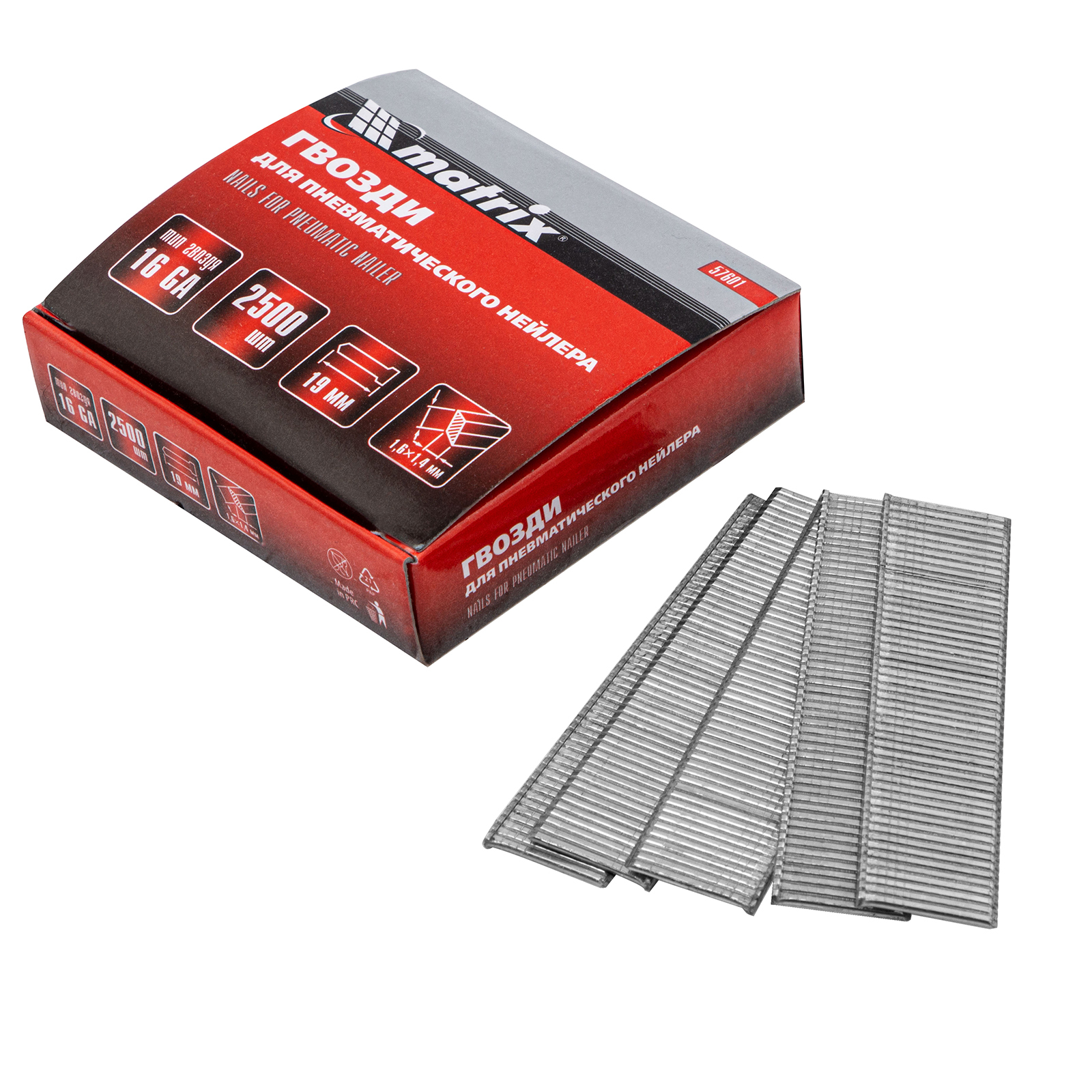 Гвозди Matrix 16GA 57601, 2500 шт. в упаковке, устанавливаются в пневматические нейлеры, совместимые с крепежами сечением 1,6 х 1,4 и длиной 19 мм. Используются для закрепления вагонки, сайдинга, черепицы и гипсокартона на деревянных поверхностях. Будут полезны во время строительства и ремонта.