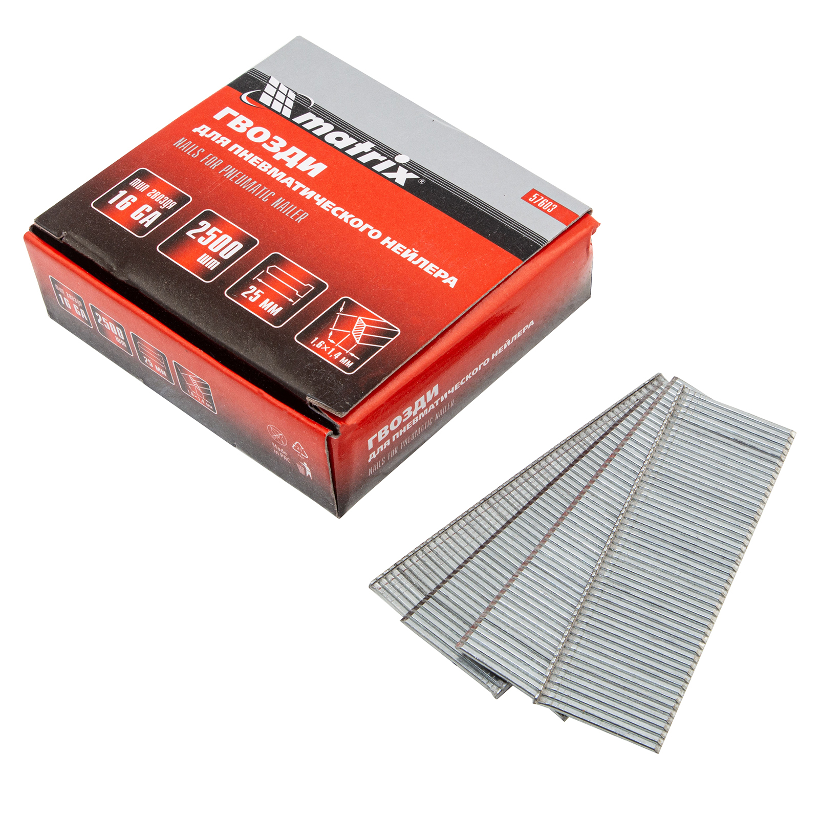 Гвозди Matrix 16GA 57603, 2500 шт. в упаковке, подходят к пневматическим нейлерам, совместимым с крепежами сечением 1,6 х 1,4 мм и длиной 25 мм. Они служат для монтажа кровельных покрытий, обшивки, утеплителей, настила и используются во время строительных и ремонтных работ.