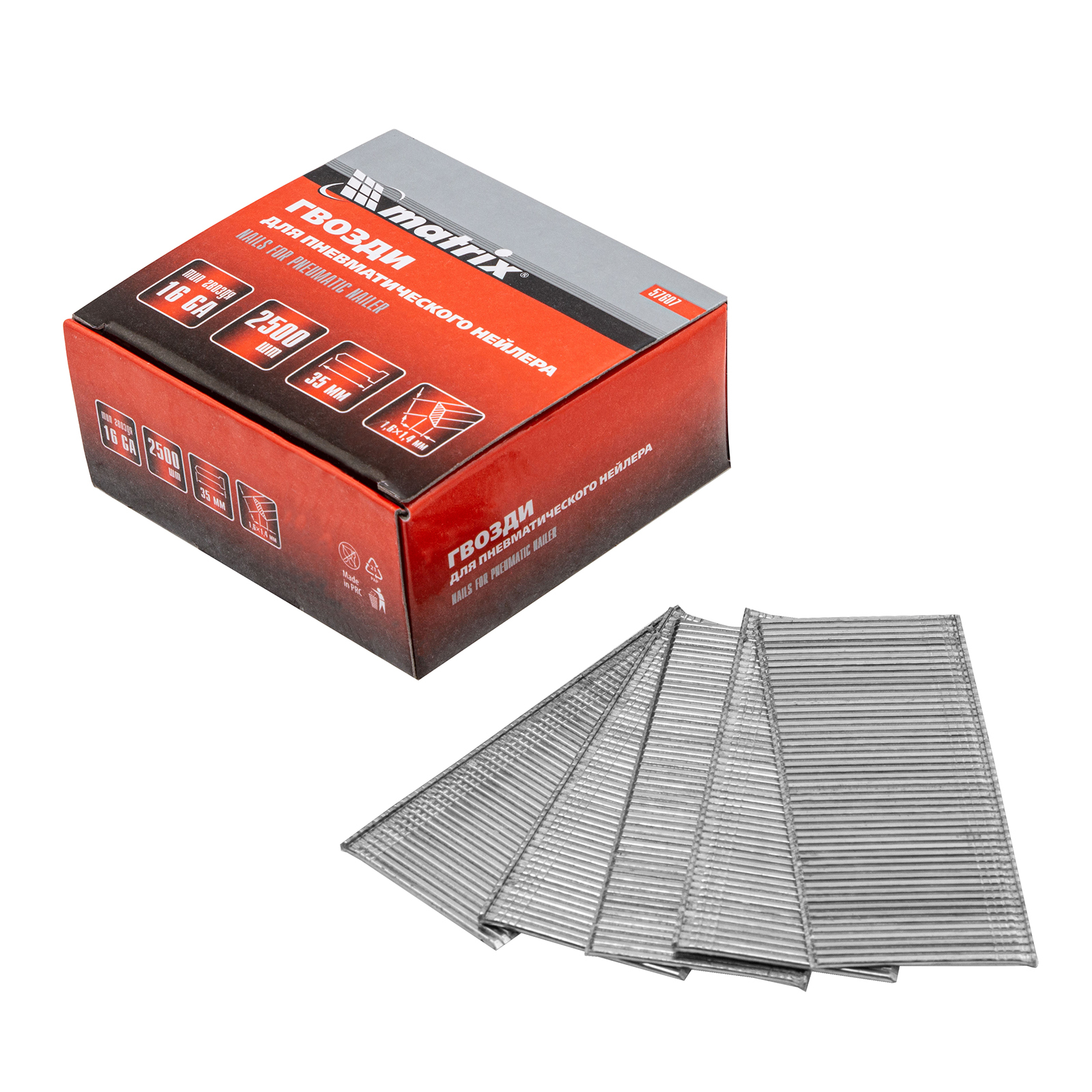 Гвозди Matrix 57607 типа 16GA, с сечением 1,6 x 1.4 мм, длиной 35 мм, 2500 шт. в упаковке, совместимы с пневматическими нейлерами любых торговых марок. Используются для проведения монтажных и строительных работ. Обеспечивают надежную фиксацию материалов на деревянных и металлических поверхностях, оптимальны для сборки мебели, скрепления различных листовых заготовок.