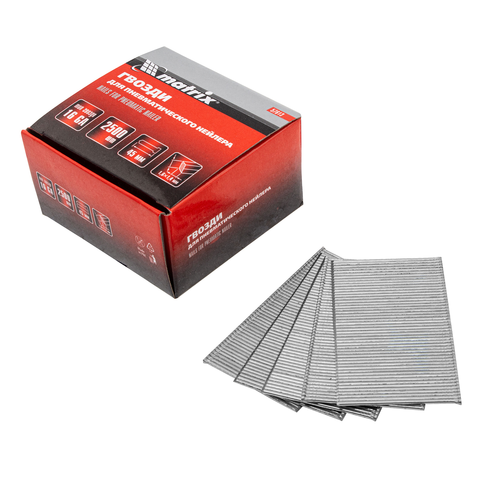 Гвозди Matrix 57613 сечением 1,6 х 1,4 мм и длиной 45 мм предназначены для пневматических нейлеров, работающих с оснасткой типа 16 GA. Помогают закрепить вагонку на стенах, собрать мебель, возвести бытовые постройки, заменить обычный молоток на стройках и при ремонтных работах.