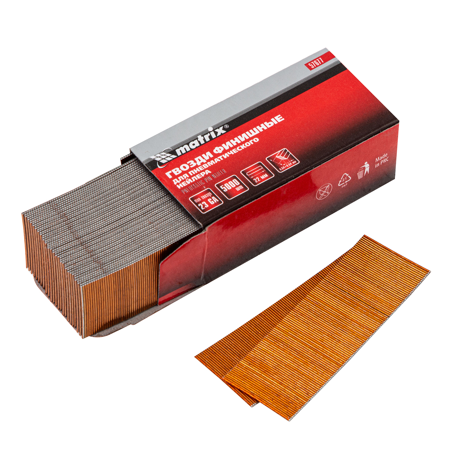 Гвозди финишные (шпильки) Matrix 23GA 57677 диаметром 0,64 мм и длиной 22 мм, 5000 шт., подходят для работы с любыми пневматическими нейлерами и широко используются в строительных, монтажных и ремонтных работах. Способны скреплять даже прочные древесные материалы, например, из ясеня и дуба. Могут применяться для декорирования потолка и стен, создания элементов дизайна и сборки мягкой корпусной мебели.