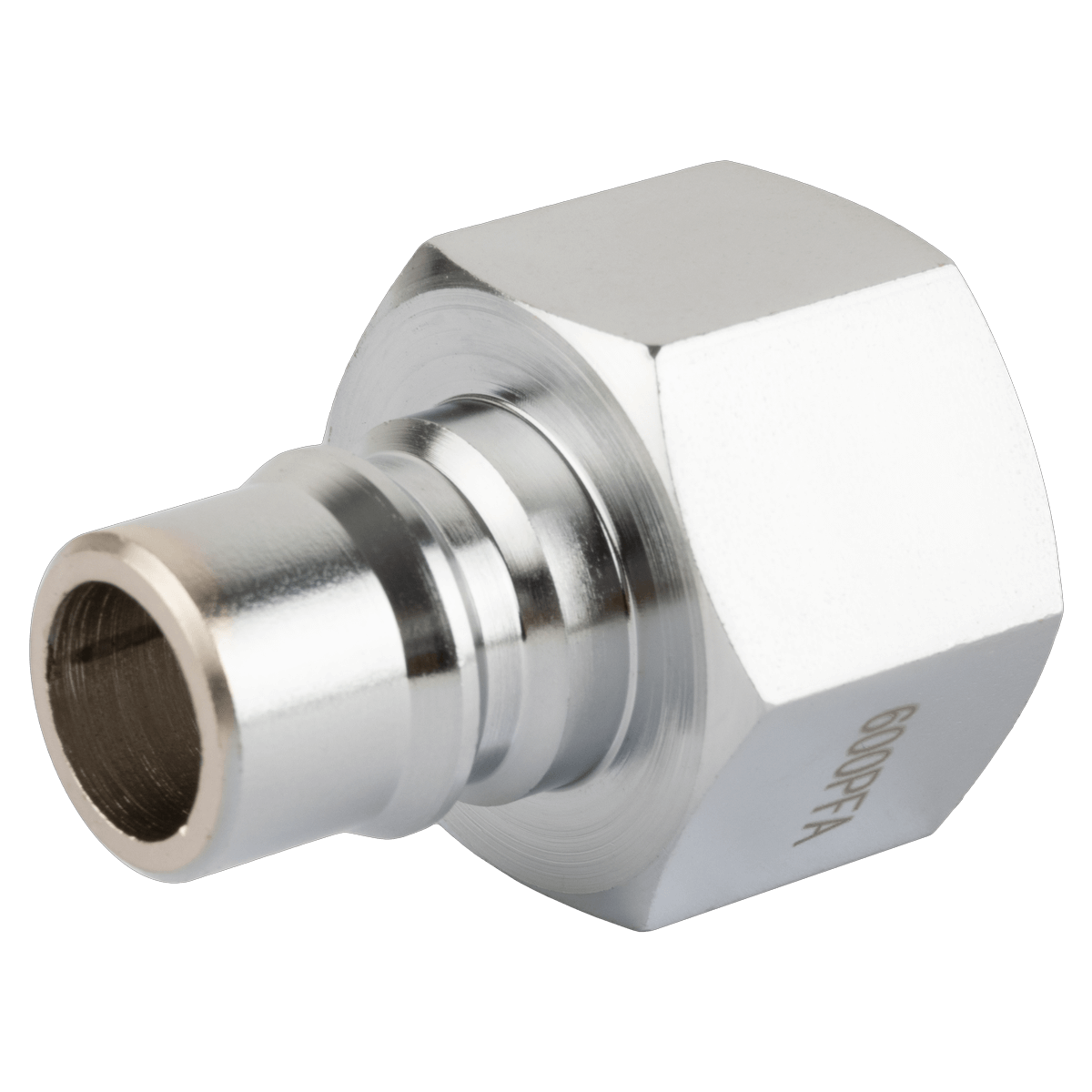 Штекер высокой пропускной способности для соединения пневматических магистралей с большим сечением шланга HRS-600PFA применяется для подключения пневматического инструмента и оборудования, соединения различных элементов. С одной стороны, фитинг имеет быстроразъёмное соединение типа рапид «папа», с другой – внутреннюю резьбу 3/4″F. Разъем «папа» подсоединяется к подходящему разъему типа «мама».