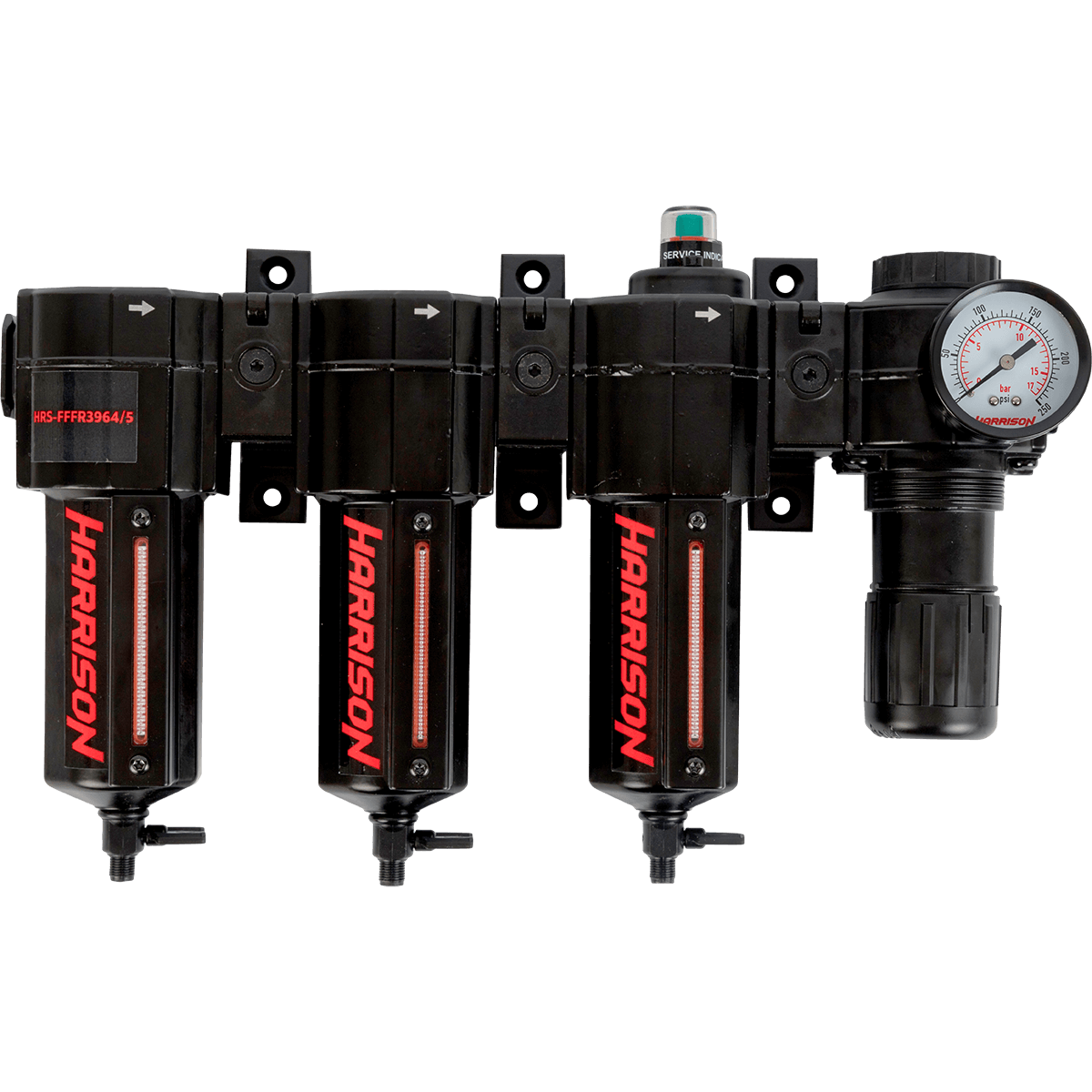 Блок подготовки с фильтрами 5 мкм, 1 мкм (3964 л/мин), масляным фильтром 0.01 мкм (990 л/мин) и регулятором 1/2″.