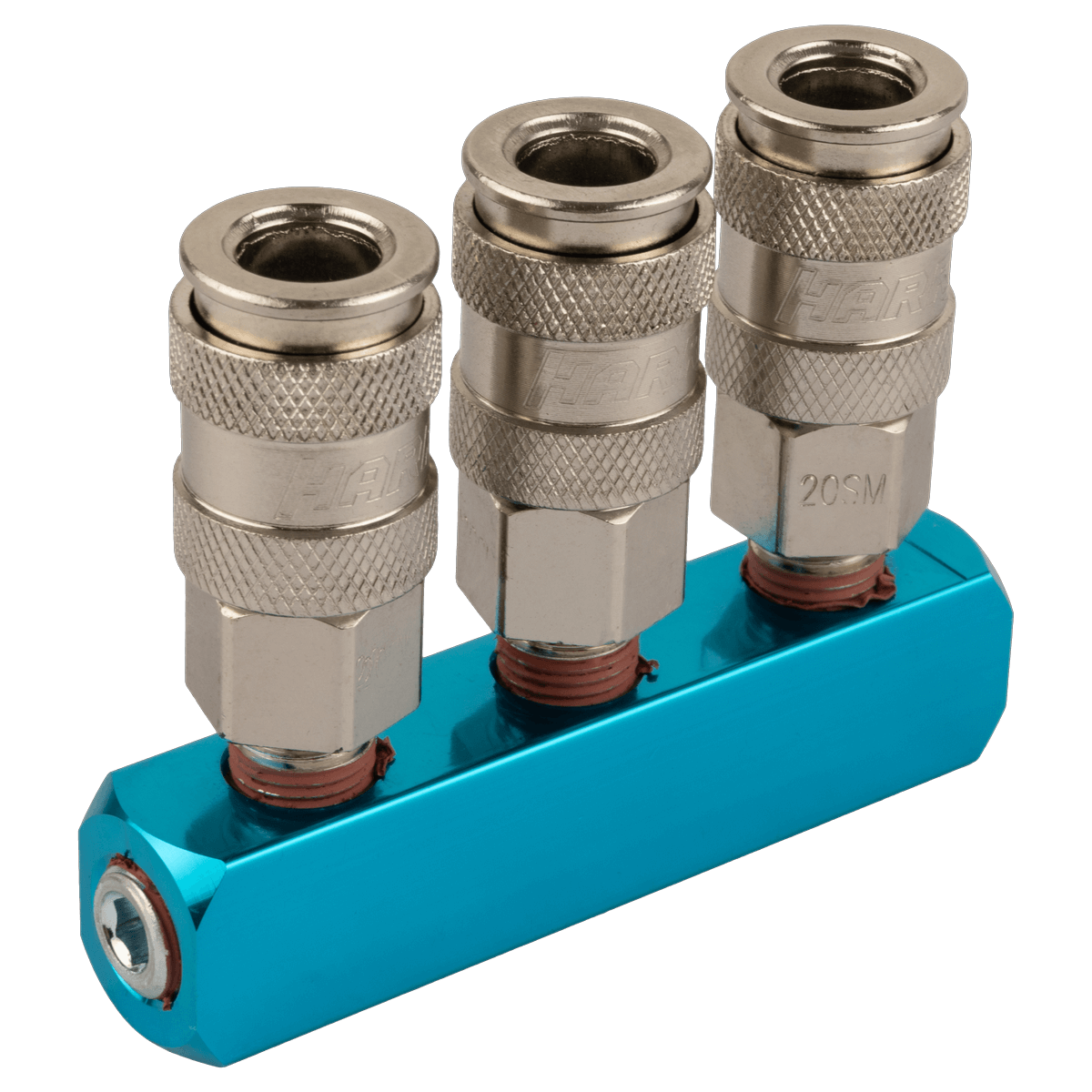 Разветвитель пневматический прямой HRS-SML используется совместно с компрессорным оборудованием для подключения трех пневмоинструментов. Изготовлен из стали. Оснащен тремя разъемами рапид тип «мама» и тремя отверстиями с внутренней резьбой 1/4″F. Разъем «мама» подсоединяется к подходящему разъему типа «папа».